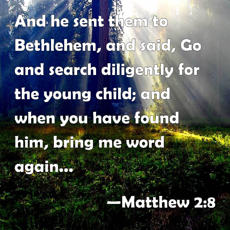 Choose a Background Matthew 2:8 And he sent them to Bethlehem, and said, Go and search diligently for the young child; and when you have found him, bring me word again, that I may come and worship him also. KJV: And he sent them to Bethlehem, and said, Go and search diligently for the young child; and when ye have found him, bring me word again, that I may come and worship him also. DRB: And sending them into Bethlehem, said: Go and diligently inquire after the child, and when you have found him, bring me word again, that I also may come to adore him. DBT: and having sent them to Bethlehem, said, Go, search out accurately concerning the child, and when ye shall have found him bring me back word, so that I also may come and do him homage. ERV: And he sent them to Bethlehem, and said, Go and search out carefully concerning the young child; and when ye have found him, bring me word, that I also may come and worship him. WBT: And he sent them to Bethlehem, and said, Go, and search diligently for the young child; and when ye have found him, bring me word again, that I may come and worship him also. WEB: He sent them to Bethlehem, and said, "Go and search diligently for the young child. When you have found him, bring me word, so that I also may come and worship him." YLT: and having sent them to Beth-Lehem, he said, 'Having gone — inquire ye exactly for the child, and whenever ye may have found, bring me back word, that I also having come may bow to him.'Links Matthew 2:8 NIV • Matthew 2:8 NLT • Matthew 2:8 ESV • Matthew 2:8 NASB • Matthew 2:8 KJV • Matthew 2:8 Interlinear • Matthew 2:8 Commentaries • Matthew 2:8 Parallel Texts • Matthew 2:8 Bible Apps • Matthew 2:8 Parallel • Bible Hub |