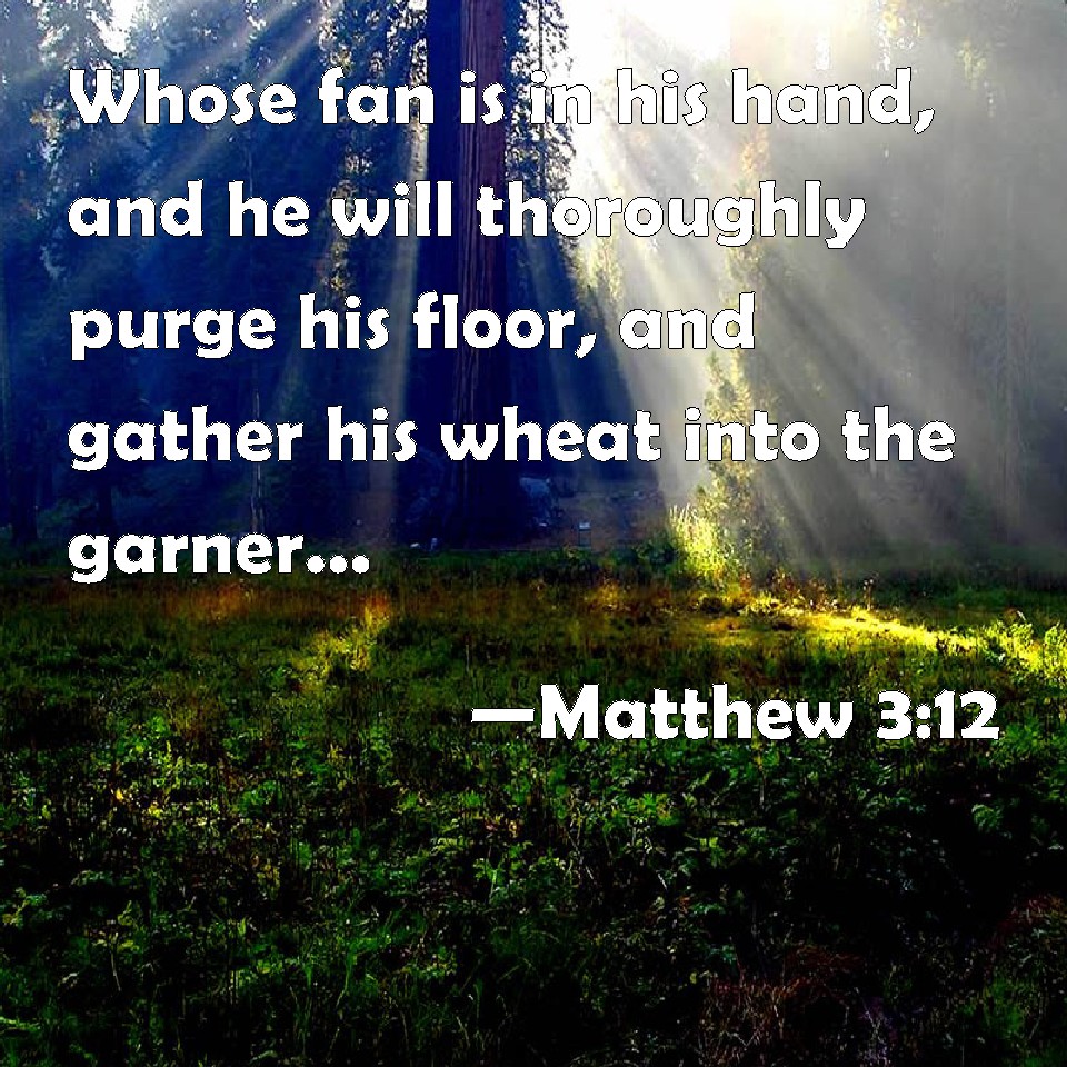Choose a Background Matthew 3:12 Whose fan is in his hand, and he will thoroughly purge his floor, and gather his wheat into the garner; but he will burn up the chaff with unquenchable fire. KJV: Whose fan is in his hand, and he will throughly purge his floor, and gather his wheat into the garner; but he will burn up the chaff with unquenchable fire. DRB: Whose fan is in his hand, and he will thoroughly cleanse his floor and gather his wheat into the barn; but the chaff he will burn with unquenchable fire. DBT: whose winnowing fan is in his hand, and he shall thoroughly purge his threshing-floor, and shall gather his wheat into the garner, but the chaff he will burn with fire unquenchable. ERV: whose fan is in his hand, and he will throughly cleanse his threshing-floor; and he will gather his wheat into the garner, but the chaff he will burn up with unquenchable fire. WBT: Whose fan is in his hand, and he will thoroughly cleanse his floor, and gather his wheat into the granary; but he will burn the chaff with unquenchable fire. WEB: His winnowing fork is in his hand, and he will thoroughly cleanse his threshing floor. He will gather his wheat into the barn, but the chaff he will burn up with unquenchable fire." YLT: whose fan is in his hand, and he will thoroughly cleanse his floor, and will gather his wheat to the storehouse, but the chaff he will burn with fire unquenchable.'Links Matthew 3:12 NIV • Matthew 3:12 NLT • Matthew 3:12 ESV • Matthew 3:12 NASB • Matthew 3:12 KJV • Matthew 3:12 Interlinear • Matthew 3:12 Commentaries • Matthew 3:12 Parallel Texts • Matthew 3:12 Bible Apps • Matthew 3:12 Parallel • Bible Hub |