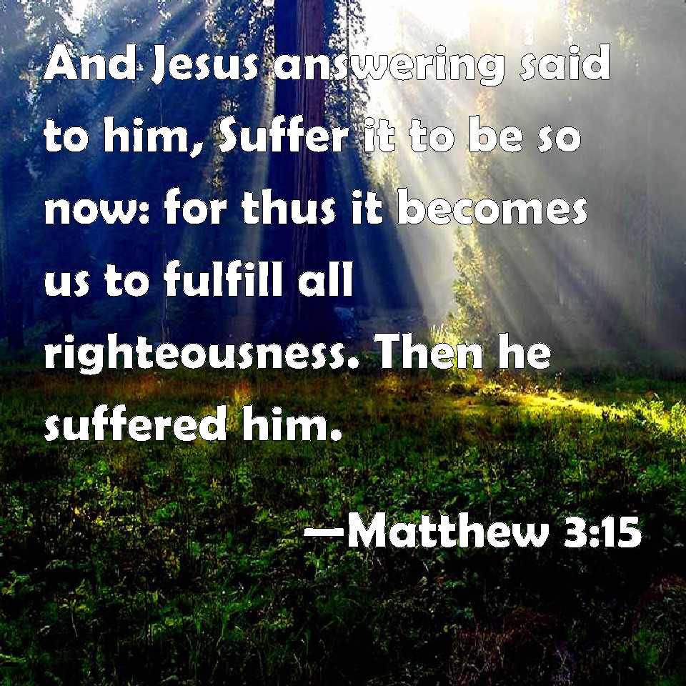 Choose a Background Matthew 3:15 And Jesus answering said to him, Suffer it to be so now: for thus it becomes us to fulfill all righteousness. Then he suffered him. KJV: And Jesus answering said unto him, Suffer it to be so now: for thus it becometh us to fulfil all righteousness. Then he suffered him. DRB: And Jesus answering, said to him: Suffer it to be so now. For so it becometh us to fulfill all justice. Then he suffered him. DBT: But Jesus answering said to him, Suffer it now; for thus it becometh us to fulfil all righteousness. Then he suffers him. ERV: But Jesus answering said unto him, Suffer it now: for thus it becometh us to fulfill all righteousness. Then he suffereth him. WBT: And Jesus answering said to him, Suffer it to be so now: for thus it becometh us to fulfill all righteousness. Then he suffered him. WEB: But Jesus, answering, said to him, "Allow it now, for this is the fitting way for us to fulfill all righteousness." Then he allowed him. YLT: But Jesus answering said to him, 'Suffer now, for thus it is becoming to us to fulfil all righteousness,' then he doth suffer him.Links Matthew 3:15 NIV • Matthew 3:15 NLT • Matthew 3:15 ESV • Matthew 3:15 NASB • Matthew 3:15 KJV • Matthew 3:15 Interlinear • Matthew 3:15 Commentaries • Matthew 3:15 Parallel Texts • Matthew 3:15 Bible Apps • Matthew 3:15 Parallel • Bible Hub |