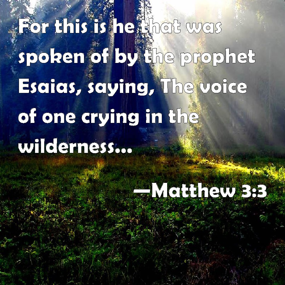 Choose a Background Matthew 3:3 For this is he that was spoken of by the prophet Esaias, saying, The voice of one crying in the wilderness, Prepare you the way of the Lord, make his paths straight. KJV: For this is he that was spoken of by the prophet Esaias, saying, The voice of one crying in the wilderness, Prepare ye the way of the Lord, make his paths straight. DRB: For this is he that was spoken of by Isaias the prophet, saying: A voice of one crying in the desert, Prepare ye the way of the Lord, make straight his paths. DBT: For this is he who has been spoken of through Esaias the prophet, saying, Voice of him that crieth in the wilderness: prepare ye the way of the Lord, make straight his paths. ERV: For this is he that was spoken of by Isaiah the prophet, saying, The voice of one crying in the wilderness, Make ye ready the way of the Lord, Make his paths straight. WBT: For this is he that was spoken of by the prophet Isaiah, saying, The voice of one crying in the wilderness, Prepare ye the way of the Lord, make his paths straight. WEB: For this is he who was spoken of by Isaiah the prophet, saying, "The voice of one crying in the wilderness, make ready the way of the Lord. Make his paths straight." YLT: for this is he who was spoken of by Isaiah the prophet, saying, 'A voice of one crying in the wilderness, Prepare ye the way of the Lord, straight make ye His paths.'Links Matthew 3:3 NIV • Matthew 3:3 NLT • Matthew 3:3 ESV • Matthew 3:3 NASB • Matthew 3:3 KJV • Matthew 3:3 Interlinear • Matthew 3:3 Commentaries • Matthew 3:3 Parallel Texts • Matthew 3:3 Bible Apps • Matthew 3:3 Parallel • Bible Hub |