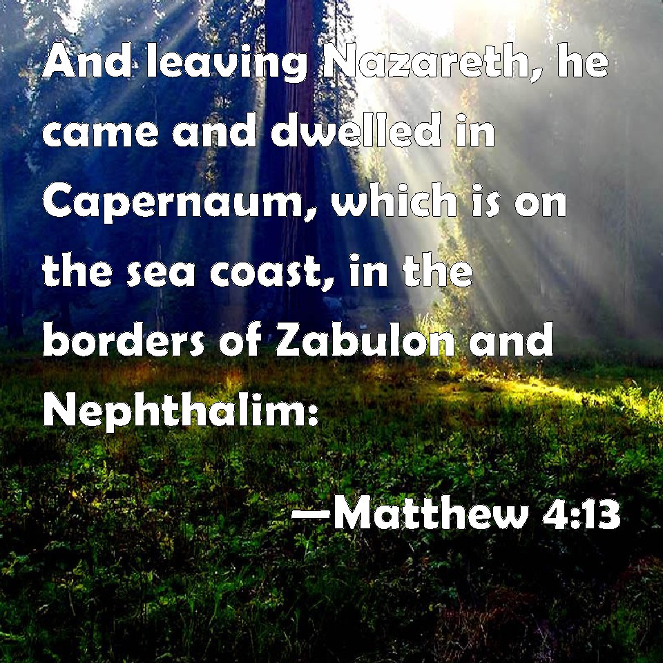 Choose a Background Matthew 4:13 And leaving Nazareth, he came and dwelled in Capernaum, which is on the sea coast, in the borders of Zabulon and Nephthalim: KJV: And leaving Nazareth, he came and dwelt in Capernaum, which is upon the sea coast, in the borders of Zabulon and Nephthalim: DRB: And leaving the city Nazareth, he came and dwelt in Capharnaum on the sea coast, in the borders of Zabulon and Nephthalim; DBT: and having left Nazareth, he went and dwelt at Capernaum, which is on the sea-side in the borders of Zabulon and Nepthalim, ERV: and leaving Nazareth, he came and dwelt in Capernaum, which is by the sea, in the borders of Zebulun and Naphtali: WBT: And leaving Nazareth, he came and dwelt in Capernaum, which is upon the sea coast, in the borders of Zabulon and Nephthalim; WEB: Leaving Nazareth, he came and lived in Capernaum, which is by the sea, in the region of Zebulun and Naphtali, YLT: and having left Nazareth, having come, he dwelt at Capernaum that is by the sea, in the borders of Zebulun and Naphtalim,Links Matthew 4:13 NIV • Matthew 4:13 NLT • Matthew 4:13 ESV • Matthew 4:13 NASB • Matthew 4:13 KJV • Matthew 4:13 Interlinear • Matthew 4:13 Commentaries • Matthew 4:13 Parallel Texts • Matthew 4:13 Bible Apps • Matthew 4:13 Parallel • Bible Hub |