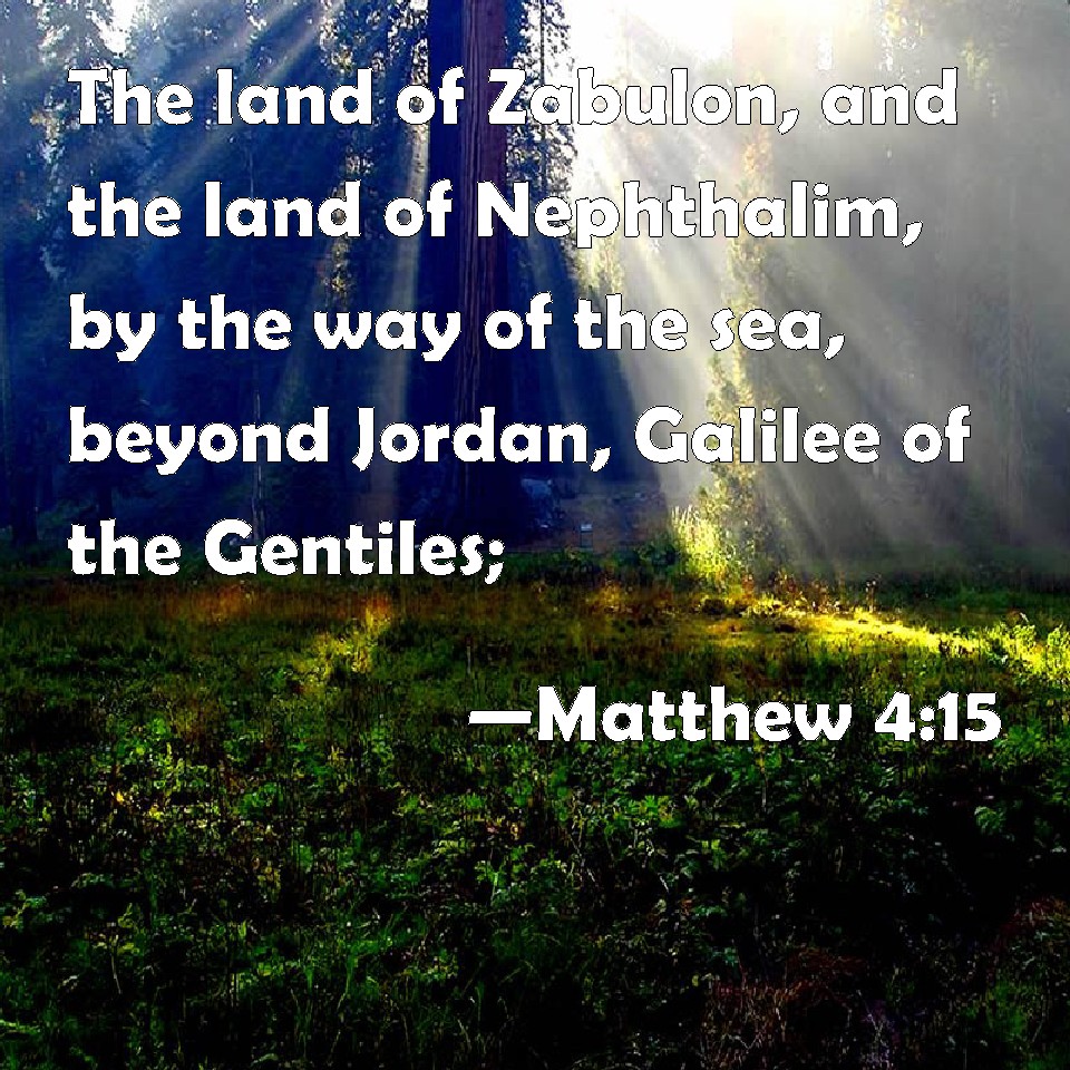 Choose a Background Matthew 4:15 The land of Zabulon, and the land of Nephthalim, by the way of the sea, beyond Jordan, Galilee of the Gentiles; KJV: The land of Zabulon, and the land of Nephthalim, by the way of the sea, beyond Jordan, Galilee of the Gentiles; DRB: Land of Zabulon and land of Nephthalim, the way of the sea beyond the Jordan, Galilee of the Gentiles: DBT: Land of Zabulon and land of Nepthalim, way of the sea beyond the Jordan, Galilee of the nations: ERV: The land of Zebulun and the land of Naphtali, Toward the sea, beyond Jordan, Galilee of the Gentiles, WBT: The land of Zabulon, and the land of Nephthalim, by the way of the sea, beyond Jordan, Galilee of the Gentiles: WEB: "The land of Zebulun and the land of Naphtali, toward the sea, beyond the Jordan, Galilee of the Gentiles, YLT: Land of Zebulun and land of Naphtali, way of the sea, beyond the Jordan, Galilee of the nations! — Links Matthew 4:15 NIV • Matthew 4:15 NLT • Matthew 4:15 ESV • Matthew 4:15 NASB • Matthew 4:15 KJV • Matthew 4:15 Interlinear • Matthew 4:15 Commentaries • Matthew 4:15 Parallel Texts • Matthew 4:15 Bible Apps • Matthew 4:15 Parallel • Bible Hub |