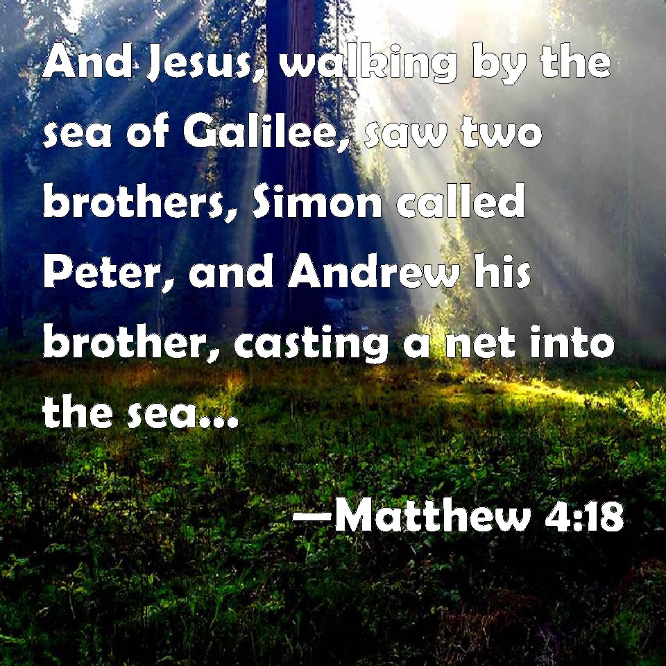 Choose a Background Matthew 4:18 And Jesus, walking by the sea of Galilee, saw two brothers, Simon called Peter, and Andrew his brother, casting a net into the sea: for they were fishers. KJV: And Jesus, walking by the sea of Galilee, saw two brethren, Simon called Peter, and Andrew his brother, casting a net into the sea: for they were fishers. DRB: And Jesus walking by the sea of Galilee, saw two brethren, Simon who is called Peter, and Andrew his brother, casting a net into the sea (for they were fishers). DBT: And walking by the sea of Galilee, he saw two brothers, Simon called Peter, and Andrew his brother, casting a net into the sea, for they were fishers; ERV: And walking by the sea of Galilee, he saw two brethren, Simon who is called Peter, and Andrew his brother, casting a net into the sea; for they were fishers. WBT: And Jesus, walking by the sea of Galilee, saw two brethren, Simon called Peter, and Andrew his brother, casting a net into the sea: for they were fishers. WEB: Walking by the sea of Galilee, he saw two brothers: Simon, who is called Peter, and Andrew, his brother, casting a net into the sea; for they were fishermen. YLT: And Jesus, walking by the sea of Galilee, saw two brothers, Simon named Peter and Andrew his brother, casting a drag into the sea — for they were fishers — Links Matthew 4:18 NIV • Matthew 4:18 NLT • Matthew 4:18 ESV • Matthew 4:18 NASB • Matthew 4:18 KJV • Matthew 4:18 Interlinear • Matthew 4:18 Commentaries • Matthew 4:18 Parallel Texts • Matthew 4:18 Bible Apps • Matthew 4:18 Parallel • Bible Hub |