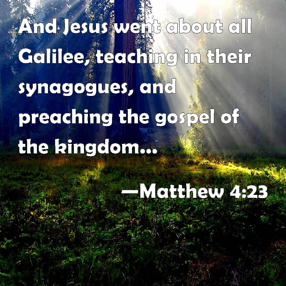 Choose a Background Matthew 4:23 And Jesus went about all Galilee, teaching in their synagogues, and preaching the gospel of the kingdom, and healing all manner of sickness and all manner of disease among the people. KJV: And Jesus went about all Galilee, teaching in their synagogues, and preaching the gospel of the kingdom, and healing all manner of sickness and all manner of disease among the people. DRB: And Jesus went about all Galilee, teaching in their synagogues, and preaching the gospel of the kingdom: and healing all manner of sickness and every infirmity, among the people. DBT: And Jesus went round the whole of Galilee, teaching in their synagogues, and preaching the glad tidings of the kingdom, and healing every disease and every bodily weakness among the people. ERV: And Jesus went about in all Galilee, teaching in their synagogues, and preaching the gospel of the kingdom, and healing all manner of disease and all manner of sickness among the people. WBT: And Jesus went about all Galilee, teaching in their synagogues, and preaching the gospel of the kingdom, and healing all manner of sickness, and all manner of disease among the people. WEB: Jesus went about in all Galilee, teaching in their synagogues, preaching the Good News of the Kingdom, and healing every disease and every sickness among the people. YLT: And Jesus was going about all Galilee teaching in their synagogues, and proclaiming the good news of the reign, and healing every disease, and every malady among the people,Links Matthew 4:23 NIV • Matthew 4:23 NLT • Matthew 4:23 ESV • Matthew 4:23 NASB • Matthew 4:23 KJV • Matthew 4:23 Interlinear • Matthew 4:23 Commentaries • Matthew 4:23 Parallel Texts • Matthew 4:23 Bible Apps • Matthew 4:23 Parallel • Bible Hub |