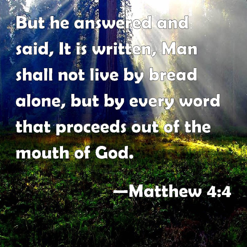 Choose a Background Matthew 4:4 But he answered and said, It is written, Man shall not live by bread alone, but by every word that proceeds out of the mouth of God. KJV: But he answered and said, It is written, Man shall not live by bread alone, but by every word that proceedeth out of the mouth of God. DRB: Who answered and said: It is written, Not in bread alone doth man live, but in every word that proceedeth from the mouth of God. DBT: But he answering said, It is written, Man shall not live by bread alone, but by every word which goes out through God's mouth. ERV: But he answered and said, It is written, Man shall not live by bread alone, but by every word that proceedeth out of the mouth of God. WBT: But he answered and said, It is written, Man shall not live by bread alone, but by every word that proceedeth out of the mouth of God. WEB: But he answered, "It is written, 'Man shall not live by bread alone, but by every word that proceeds out of the mouth of God.'" YLT: But he answering said, 'It hath been written, Not upon bread alone doth man live, but upon every word coming forth from the mouth of God.'Links Matthew 4:4 NIV • Matthew 4:4 NLT • Matthew 4:4 ESV • Matthew 4:4 NASB • Matthew 4:4 KJV • Matthew 4:4 Interlinear • Matthew 4:4 Commentaries • Matthew 4:4 Parallel Texts • Matthew 4:4 Bible Apps • Matthew 4:4 Parallel • Bible Hub |