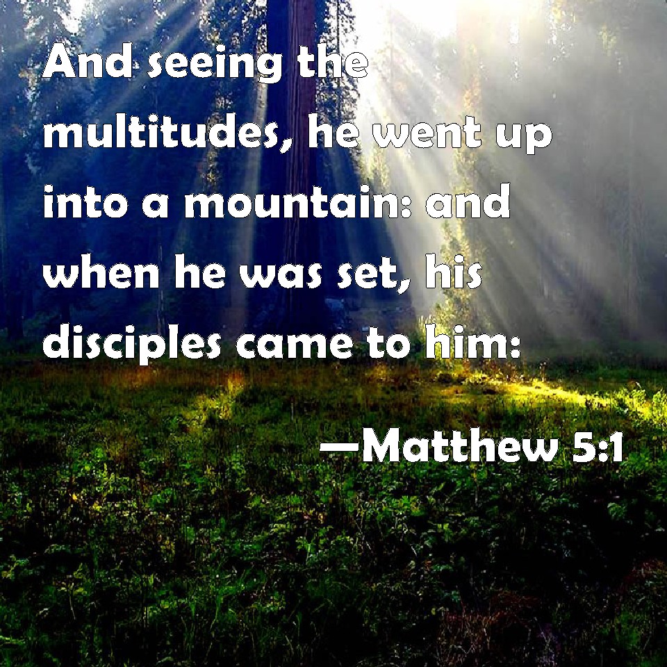 Choose a Background Matthew 5:1 And seeing the multitudes, he went up into a mountain: and when he was set, his disciples came to him: KJV: And seeing the multitudes, he went up into a mountain: and when he was set, his disciples came unto him: DRB: AND seeing the multitudes, he went up into a mountain, and when he was set down, his disciples came unto him. DBT: But seeing the crowds, he went up into the mountain, and having sat down, his disciples came to him; ERV: And seeing the multitudes, he went up into the mountain: and when he had sat down, his disciples came unto him: WBT: And seeing the multitudes, he ascended a mountain: and when he was seated, his disciples came to him. WEB: Seeing the multitudes, he went up onto the mountain. When he had sat down, his disciples came to him. YLT: And having seen the multitudes, he went up to the mount, and he having sat down, his disciples came to him,Links Matthew 5:1 NIV • Matthew 5:1 NLT • Matthew 5:1 ESV • Matthew 5:1 NASB • Matthew 5:1 KJV • Matthew 5:1 Interlinear • Matthew 5:1 Commentaries • Matthew 5:1 Parallel Texts • Matthew 5:1 Bible Apps • Matthew 5:1 Parallel • Bible Hub |