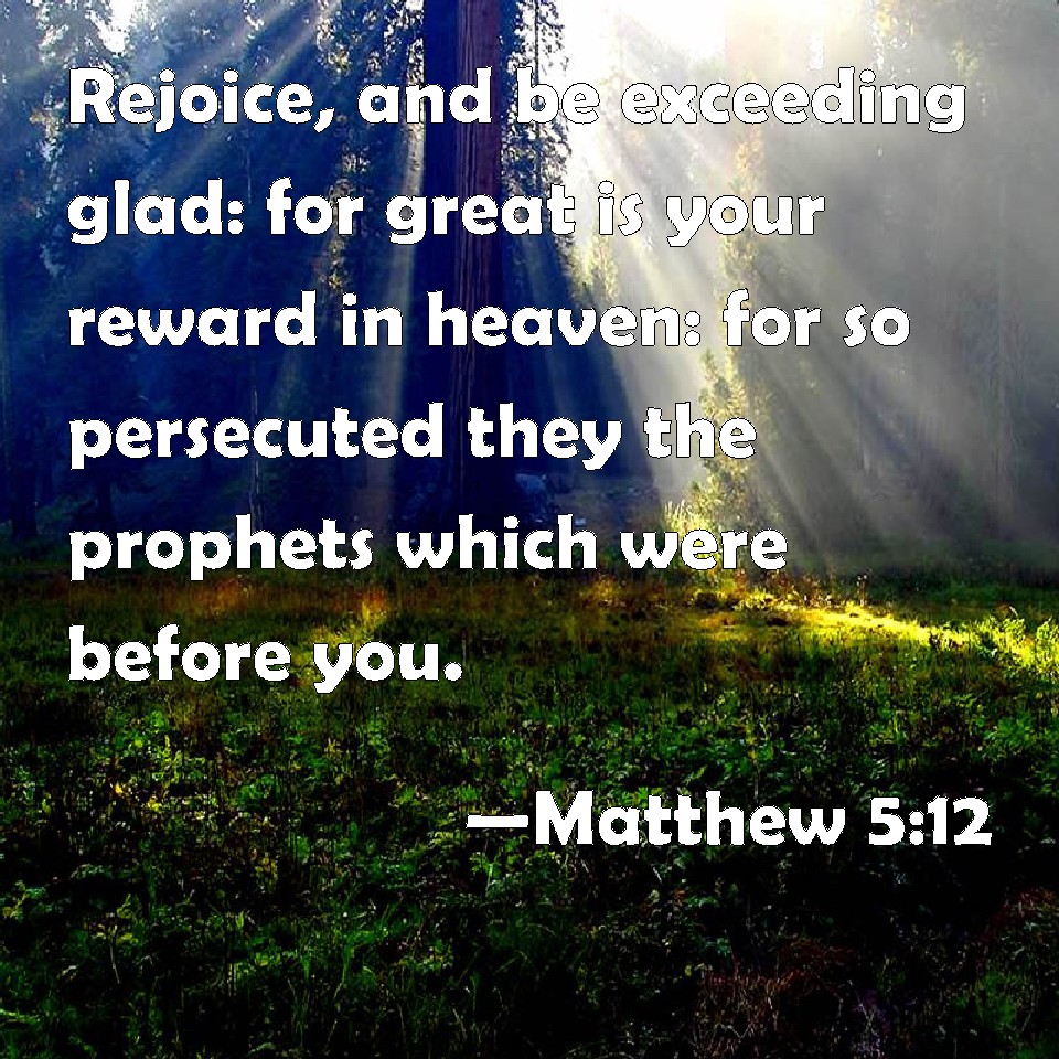 Choose a Background Matthew 5:12 Rejoice, and be exceeding glad: for great is your reward in heaven: for so persecuted they the prophets which were before you. KJV: Rejoice, and be exceeding glad: for great is your reward in heaven: for so persecuted they the prophets which were before you. DRB: Be glad and rejoice, for your reward is very great in heaven. For so they persecuted the prophets that were before you. DBT: Rejoice and exult, for your reward is great in the heavens; for thus have they persecuted the prophets who were before you. ERV: Rejoice, and be exceeding glad: for great is your reward in heaven: for so persecuted they the prophets which were before you. WBT: Rejoice, and be exceeding glad: for great is your reward in heaven: for so they persecuted the prophets who were before you. WEB: Rejoice, and be exceedingly glad, for great is your reward in heaven. For that is how they persecuted the prophets who were before you. YLT: rejoice ye and be glad, because your reward is great in the heavens, for thus did they persecute the prophets who were before you.Links Matthew 5:12 NIV • Matthew 5:12 NLT • Matthew 5:12 ESV • Matthew 5:12 NASB • Matthew 5:12 KJV • Matthew 5:12 Interlinear • Matthew 5:12 Commentaries • Matthew 5:12 Parallel Texts • Matthew 5:12 Bible Apps • Matthew 5:12 Parallel • Bible Hub |