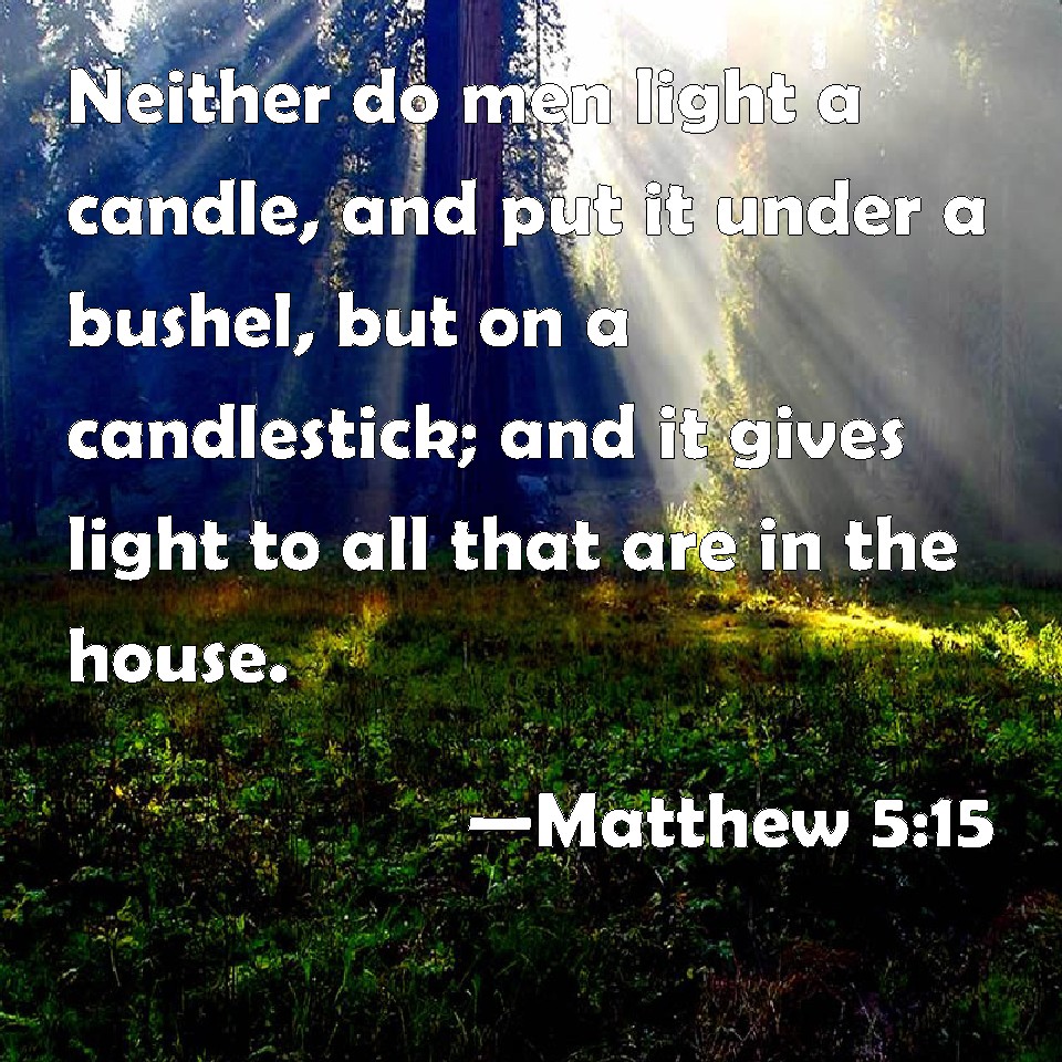 Choose a Background Matthew 5:15 Neither do men light a candle, and put it under a bushel, but on a candlestick; and it gives light to all that are in the house. KJV: Neither do men light a candle, and put it under a bushel, but on a candlestick; and it giveth light unto all that are in the house. DRB: Neither do men light a candle and put it under a bushel, but upon a candlestick, that it may shine to all that are in the house. DBT: Nor do men light a lamp and put it under the bushel, but upon the lamp-stand, and it shines for all who are in the house. ERV: Neither do men light a lamp, and put it under the bushel, but on the stand; and it shineth unto all that are in the house. WBT: Neither do men light a candle, and put it under a close vessel, but on a candlestick: and it giveth light to all that are in the house. WEB: Neither do you light a lamp, and put it under a measuring basket, but on a stand; and it shines to all who are in the house. YLT: nor do they light a lamp, and put it under the measure, but on the lamp-stand, and it shineth to all those in the house;Links Matthew 5:15 NIV • Matthew 5:15 NLT • Matthew 5:15 ESV • Matthew 5:15 NASB • Matthew 5:15 KJV • Matthew 5:15 Interlinear • Matthew 5:15 Commentaries • Matthew 5:15 Parallel Texts • Matthew 5:15 Bible Apps • Matthew 5:15 Parallel • Bible Hub |