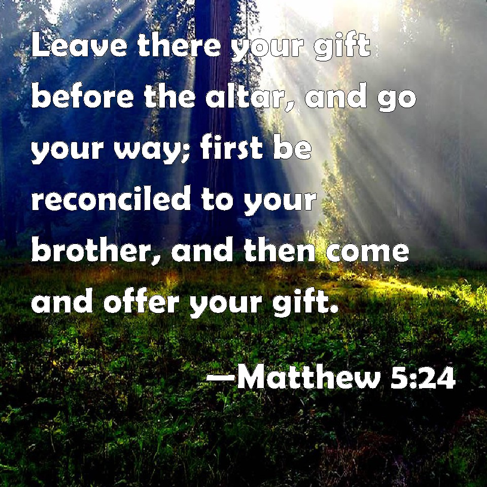 Choose a Background Matthew 5:24 Leave there your gift before the altar, and go your way; first be reconciled to your brother, and then come and offer your gift. KJV: Leave there thy gift before the altar, and go thy way; first be reconciled to thy brother, and then come and offer thy gift. DRB: Leave there thy offering before the altar, and go first to be reconciled to thy brother: and then coming thou shalt offer thy gift. DBT: leave there thy gift before the altar, and first go, be reconciled to thy brother, and then come and offer thy gift. ERV: leave there thy gift before the altar, and go thy way, first be reconciled to thy brother, and then come and offer thy gift. WBT: Leave there thy gift before the altar, and go thy way; first be reconciled to thy brother, and then come and offer thy gift. WEB: leave your gift there before the altar, and go your way. First be reconciled to your brother, and then come and offer your gift. YLT: leave there thy gift before the altar, and go — first be reconciled to thy brother, and then having come bring thy gift.Links Matthew 5:24 NIV • Matthew 5:24 NLT • Matthew 5:24 ESV • Matthew 5:24 NASB • Matthew 5:24 KJV • Matthew 5:24 Interlinear • Matthew 5:24 Commentaries • Matthew 5:24 Parallel Texts • Matthew 5:24 Bible Apps • Matthew 5:24 Parallel • Bible Hub |