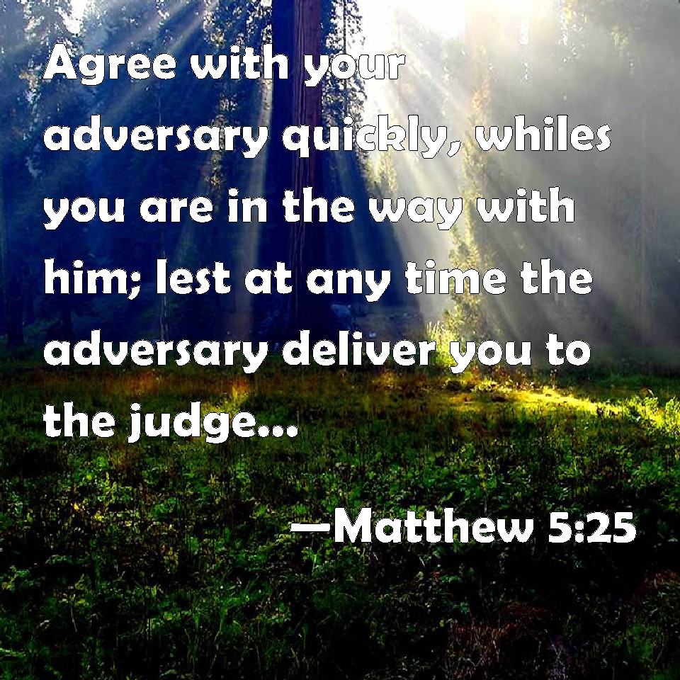 Choose a Background Matthew 5:25 Agree with your adversary quickly, whiles you are in the way with him; lest at any time the adversary deliver you to the judge, and the judge deliver you to the officer, and you be cast into prison. KJV: Agree with thine adversary quickly, whiles thou art in the way with him; lest at any time the adversary deliver thee to the judge, and the judge deliver thee to the officer, and thou be cast into prison. DRB: Be at agreement with thy adversary betimes, whilst thou art in the way with him: lest perhaps the adversary deliver thee to the judge, and the judge deliver thee to the officer, and thou be cast into prison. DBT: Make friends with thine adverse party quickly, whilst thou art in the way with him; lest some time the adverse party deliver thee to the judge, and the judge deliver thee to the officer, and thou be cast into prison. ERV: Agree with thine adversary quickly, whiles thou art with him in the way; lest haply the adversary deliver thee to the judge, and the judge deliver thee to the officer, and thou be cast into prison. WBT: Agree with thy adversary quickly, while thou art in the way with him; lest at any time the adversary deliver thee to the judge, and the judge deliver thee to the officer, and thou be cast into prison. WEB: Agree with your adversary quickly, while you are with him in the way; lest perhaps the prosecutor deliver you to the judge, and the judge deliver you to the officer, and you be cast into prison. YLT: 'Be agreeing with thy opponent quickly, while thou art in the way with him, that the opponent may not deliver thee to the judge, and the judge may deliver thee to the officer, and to prison thou mayest be cast,Links Matthew 5:25 NIV • Matthew 5:25 NLT • Matthew 5:25 ESV • Matthew 5:25 NASB • Matthew 5:25 KJV • Matthew 5:25 Interlinear • Matthew 5:25 Commentaries • Matthew 5:25 Parallel Texts • Matthew 5:25 Bible Apps • Matthew 5:25 Parallel • Bible Hub |