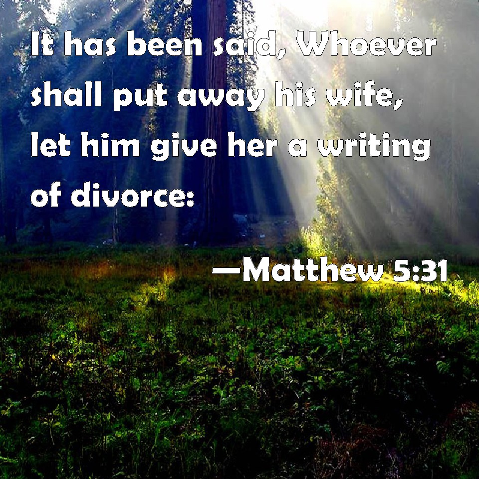 Choose a Background Matthew 5:31 It has been said, Whoever shall put away his wife, let him give her a writing of divorce: KJV: It hath been said, Whosoever shall put away his wife, let him give her a writing of divorcement: DRB: And it hath been said, Whoseoever shall put away his wife, let him give her a bill of divorce. DBT: It has been said too, Whosoever shall put away his wife, let him give her a letter of divorce. ERV: It was said also, Whosoever shall put away his wife, let him give her a writing of divorcement: WBT: It hath been said, Whoever shall put away his wife, let him give her a writing of divorcement: WEB: "It was also said, 'Whoever shall put away his wife, let him give her a writing of divorce,' YLT: 'And it was said, That whoever may put away his wife, let him give to her a writing of divorce;Links Matthew 5:31 NIV • Matthew 5:31 NLT • Matthew 5:31 ESV • Matthew 5:31 NASB • Matthew 5:31 KJV • Matthew 5:31 Interlinear • Matthew 5:31 Commentaries • Matthew 5:31 Parallel Texts • Matthew 5:31 Bible Apps • Matthew 5:31 Parallel • Bible Hub |