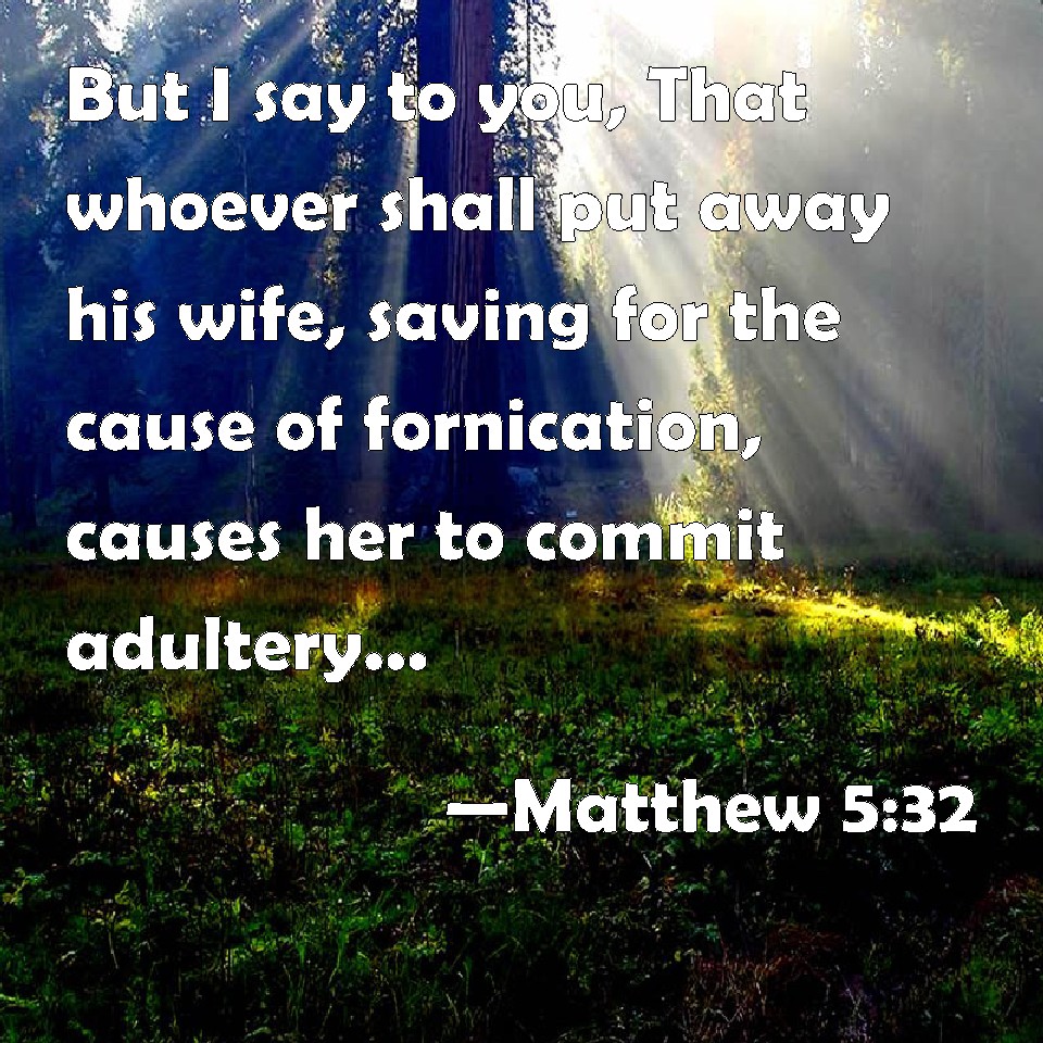 Choose a Background Matthew 5:32 But I say to you, That whoever shall put away his wife, saving for the cause of fornication, causes her to commit adultery: and whoever shall marry her that is divorced commits adultery. KJV: But I say unto you, That whosoever shall put away his wife, saving for the cause of fornication, causeth her to commit adultery: and whosoever shall marry her that is divorced committeth adultery. DRB: But I say to you, that whosoever shall put away his wife, excepting for the cause of fornication, maketh her to commit adultery: and he that shall marry her that is put away, committeth adultery. DBT: But I say unto you, that whosoever shall put away his wife, except for cause of fornication, makes her commit adultery, and whosoever marries one that is put away commits adultery. ERV: but I say unto you, that every one that putteth away his wife, saving for the cause of fornication, maketh her an adulteress: and whosoever shall marry her when she is put away committeth adultery. WBT: But I say to you, That whoever shall put away his wife, saving for the cause of lewdness, causeth her to commit adultery: and whoever shall marry her that is divorced, committeth adultery. WEB: but I tell you that whoever puts away his wife, except for the cause of sexual immorality, makes her an adulteress; and whoever marries her when she is put away commits adultery. YLT: but I — I say to you, that whoever may put away his wife, save for the matter of whoredom, doth make her to commit adultery; and whoever may marry her who hath been put away doth commit adultery.Links Matthew 5:32 NIV • Matthew 5:32 NLT • Matthew 5:32 ESV • Matthew 5:32 NASB • Matthew 5:32 KJV • Matthew 5:32 Interlinear • Matthew 5:32 Commentaries • Matthew 5:32 Parallel Texts • Matthew 5:32 Bible Apps • Matthew 5:32 Parallel • Bible Hub |