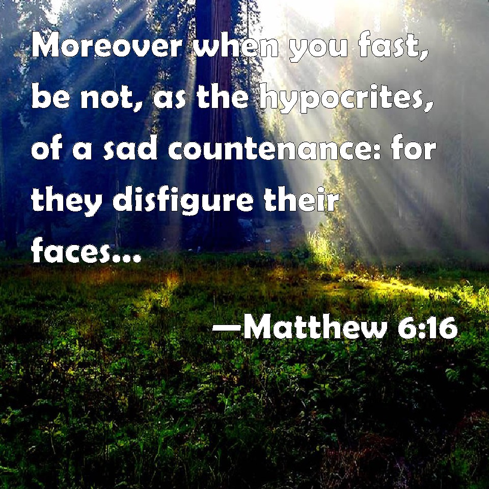 Choose a Background Matthew 6:16 Moreover when you fast, be not, as the hypocrites, of a sad countenance: for they disfigure their faces, that they may appear to men to fast. Truly I say to you, They have their reward. KJV: Moreover when ye fast, be not, as the hypocrites, of a sad countenance: for they disfigure their faces, that they may appear unto men to fast. Verily I say unto you, They have their reward. DRB: And when you fast, be not as the hypocrites, sad. For they disfigure their faces, that they may appear unto men to fast. Amen I say to you, they have received their reward. DBT: And when ye fast, be not as the hypocrites, downcast in countenance; for they disfigure their faces, so that they may appear fasting to men: verily I say unto you, They have their reward. ERV: Moreover when ye fast, be not, as the hypocrites, of a sad countenance: for they disfigure their faces, that they may be seen of men to fast. Verily I say unto you, They have received their reward. WBT: Moreover, when ye fast, be not as the hypocrites, of a sad countenance: for they disfigure their faces, that they may appear to men to fast. Verily, I say to you, they have their reward. WEB: "Moreover when you fast, don't be like the hypocrites, with sad faces. For they disfigure their faces, that they may be seen by men to be fasting. Most certainly I tell you, they have received their reward. YLT: 'And when ye may fast, be ye not as the hypocrites, of sour countenances, for they disfigure their faces, that they may appear to men fasting; verily I say to you, that they have their reward.Links Matthew 6:16 NIV • Matthew 6:16 NLT • Matthew 6:16 ESV • Matthew 6:16 NASB • Matthew 6:16 KJV • Matthew 6:16 Interlinear • Matthew 6:16 Commentaries • Matthew 6:16 Parallel Texts • Matthew 6:16 Bible Apps • Matthew 6:16 Parallel • Bible Hub |