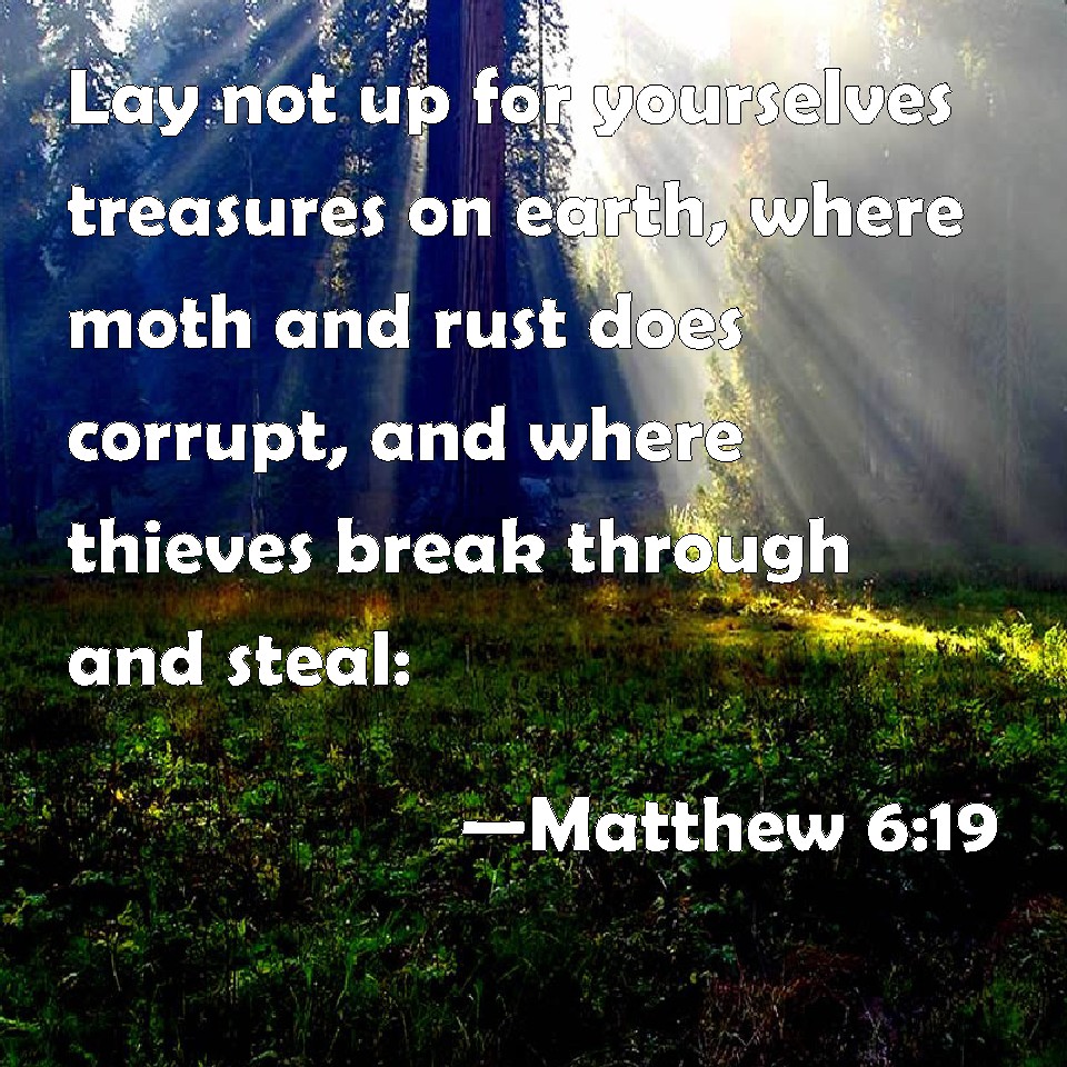 Choose a Background Matthew 6:19 Lay not up for yourselves treasures on earth, where moth and rust does corrupt, and where thieves break through and steal: KJV: Lay not up for yourselves treasures upon earth, where moth and rust doth corrupt, and where thieves break through and steal: DRB: Lay not up to yourselves treasures on earth: where the rust, and moth consume, and where thieves break through and steal. DBT: Lay not up for yourselves treasures upon the earth, where moth and rust spoils, and where thieves dig through and steal; ERV: Lay not up for yourselves treasures upon the earth, where moth and rust doth consume, and where thieves break through and steal: WBT: Lay not up for yourselves treasures upon earth, where moth and rust doth corrupt, and where thieves break through and steal: WEB: "Don't lay up treasures for yourselves on the earth, where moth and rust consume, and where thieves break through and steal; YLT: 'Treasure not up to yourselves treasures on the earth, where moth and rust disfigure, and where thieves break through and steal,Links Matthew 6:19 NIV • Matthew 6:19 NLT • Matthew 6:19 ESV • Matthew 6:19 NASB • Matthew 6:19 KJV • Matthew 6:19 Interlinear • Matthew 6:19 Commentaries • Matthew 6:19 Parallel Texts • Matthew 6:19 Bible Apps • Matthew 6:19 Parallel • Bible Hub |