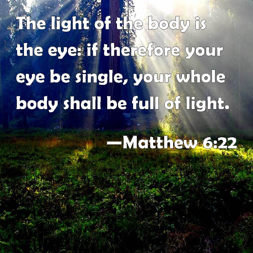 Choose a Background Matthew 6:22 The light of the body is the eye: if therefore your eye be single, your whole body shall be full of light. KJV: The light of the body is the eye: if therefore thine eye be single, thy whole body shall be full of light. DRB: The light of thy body is thy eye. If thy eye be single, thy whole body shall be lightsome. DBT: The lamp of the body is the eye; if therefore thine eye be single, thy whole body will be light: ERV: The lamp of the body is the eye: if therefore thine eye be single, thy whole body shall be full of light. WBT: The light of the body is the eye: if therefore thy eye be single, thy whole body will be full of light. WEB: "The lamp of the body is the eye. If therefore your eye is sound, your whole body will be full of light. YLT: 'The lamp of the body is the eye, if, therefore, thine eye may be perfect, all thy body shall be enlightened,Links Matthew 6:22 NIV • Matthew 6:22 NLT • Matthew 6:22 ESV • Matthew 6:22 NASB • Matthew 6:22 KJV • Matthew 6:22 Interlinear • Matthew 6:22 Commentaries • Matthew 6:22 Parallel Texts • Matthew 6:22 Bible Apps • Matthew 6:22 Parallel • Bible Hub |