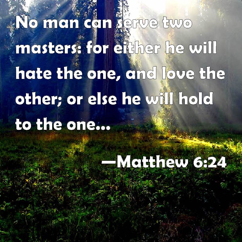 Choose a Background Matthew 6:24 No man can serve two masters: for either he will hate the one, and love the other; or else he will hold to the one, and despise the other. You cannot serve God and mammon. KJV: No man can serve two masters: for either he will hate the one, and love the other; or else he will hold to the one, and despise the other. Ye cannot serve God and mammon. DRB: No man can serve two masters. For either he will hate the one, and love the other: or he will sustain the one, and despise the other. You cannot serve God and mammon. DBT: No one can serve two masters; for either he will hate the one and will love the other, or he will hold to the one and despise the other. Ye cannot serve God and mammon. ERV: No man can serve two masters: for either he will hate the one, and love the other; or else he will hold to one, and despise the other. Ye cannot serve God and mammon. WBT: No man can serve two masters: for either he will hate the one, and love the other; or else he will hold to the one, and despise the other. Ye cannot serve God and mammon. WEB: "No one can serve two masters, for either he will hate the one and love the other; or else he will be devoted to one and despise the other. You can't serve both God and Mammon. YLT: 'None is able to serve two lords, for either he will hate the one and love the other, or he will hold to the one, and despise the other; ye are not able to serve God and Mammon.Links Matthew 6:24 NIV • Matthew 6:24 NLT • Matthew 6:24 ESV • Matthew 6:24 NASB • Matthew 6:24 KJV • Matthew 6:24 Interlinear • Matthew 6:24 Commentaries • Matthew 6:24 Parallel Texts • Matthew 6:24 Bible Apps • Matthew 6:24 Parallel • Bible Hub |