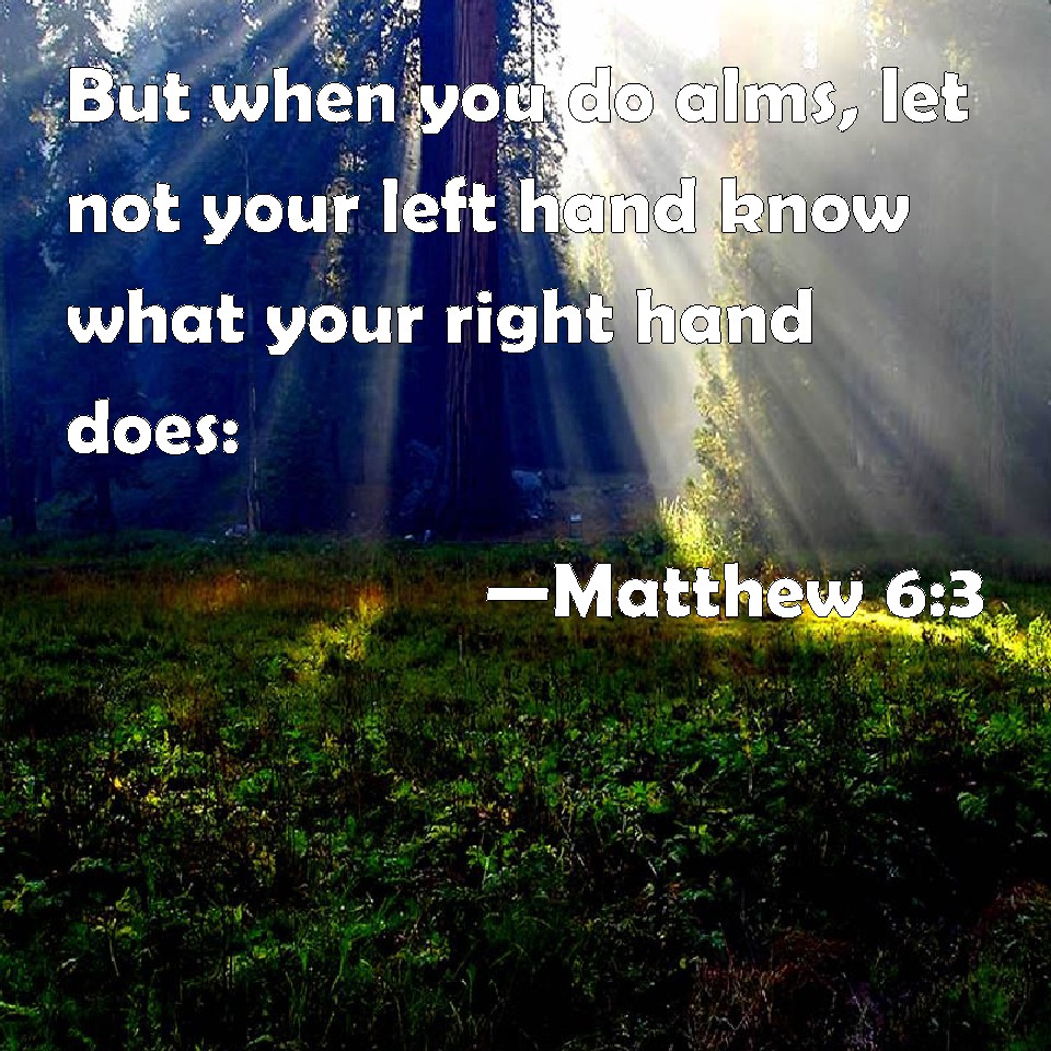 Choose a Background Matthew 6:3 But when you do alms, let not your left hand know what your right hand does: KJV: But when thou doest alms, let not thy left hand know what thy right hand doeth: DRB: But when thou dost alms, let not thy left hand know what thy right hand doth. DBT: But thou, when thou doest alms, let not thy left hand know what thy right hand does; ERV: But when thou doest alms, let not thy left hand know what thy right hand doeth: WBT: But when thou doest alms, let not thy left hand know what thy right hand doeth: WEB: But when you do merciful deeds, don't let your left hand know what your right hand does, YLT: 'But thou, doing kindness, let not thy left hand know what thy right hand doth,Links Matthew 6:3 NIV • Matthew 6:3 NLT • Matthew 6:3 ESV • Matthew 6:3 NASB • Matthew 6:3 KJV • Matthew 6:3 Interlinear • Matthew 6:3 Commentaries • Matthew 6:3 Parallel Texts • Matthew 6:3 Bible Apps • Matthew 6:3 Parallel • Bible Hub |