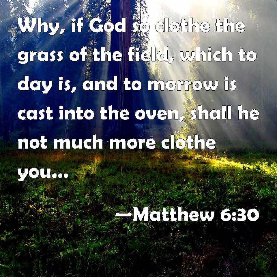 Choose a Background Matthew 6:30 Why, if God so clothe the grass of the field, which to day is, and to morrow is cast into the oven, shall he not much more clothe you, O you of little faith? KJV: Wherefore, if God so clothe the grass of the field, which to day is, and to morrow is cast into the oven, shall he not much more clothe you, O ye of little faith? DRB: And if the grass of the field, which is to day, and to morrow is cast into the oven, God doth so clothe: how much more you, O ye of little faith? DBT: But if God so clothe the herbage of the field, which is to-day, and to-morrow is cast into the oven, will he not much rather you, O ye of little faith? ERV: But if God doth so clothe the grass of the field, which today is, and tomorrow is cast into the oven, shall he not much more clothe you, O ye of little faith? WBT: Wherefore, if God so clotheth the grass of the field, which to-day is, and to-morrow is cast into the oven, will he not much more clothe you, O ye of little faith? WEB: But if God so clothes the grass of the field, which today exists, and tomorrow is thrown into the oven, won't he much more clothe you, you of little faith? YLT: And if the herb of the field, that to-day is, and to-morrow is cast to the furnace, God doth so clothe — not much more you, O ye of little faith?Links Matthew 6:30 NIV • Matthew 6:30 NLT • Matthew 6:30 ESV • Matthew 6:30 NASB • Matthew 6:30 KJV • Matthew 6:30 Interlinear • Matthew 6:30 Commentaries • Matthew 6:30 Parallel Texts • Matthew 6:30 Bible Apps • Matthew 6:30 Parallel • Bible Hub |