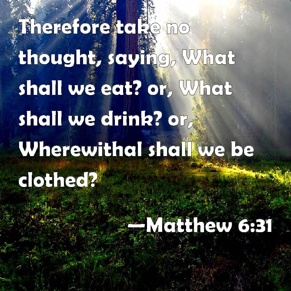 Choose a Background Matthew 6:31 Therefore take no thought, saying, What shall we eat? or, What shall we drink? or, Wherewithal shall we be clothed? KJV: Therefore take no thought, saying, What shall we eat? or, What shall we drink? or, Wherewithal shall we be clothed? DRB: Be not solicitous therefore, saying, What shall we eat: or what shall we drink, or wherewith shall we be clothed? DBT: Be not therefore careful, saying, What shall we eat? or What shall we drink? or What shall we put on? ERV: Be not therefore anxious, saying, What shall we eat? or, What shall drink? or, Wherewithal shall we be clothed? WBT: Therefore be not anxious, saying, What shall we eat? or what shall we drink? or, with what shall we be clothed? WEB: "Therefore don't be anxious, saying, 'What will we eat?', 'What will we drink?' or, 'With what will we be clothed?' YLT: therefore ye may not be anxious, saying, What may we eat? or, What may we drink? or, What may we put round?Links Matthew 6:31 NIV • Matthew 6:31 NLT • Matthew 6:31 ESV • Matthew 6:31 NASB • Matthew 6:31 KJV • Matthew 6:31 Interlinear • Matthew 6:31 Commentaries • Matthew 6:31 Parallel Texts • Matthew 6:31 Bible Apps • Matthew 6:31 Parallel • Bible Hub |