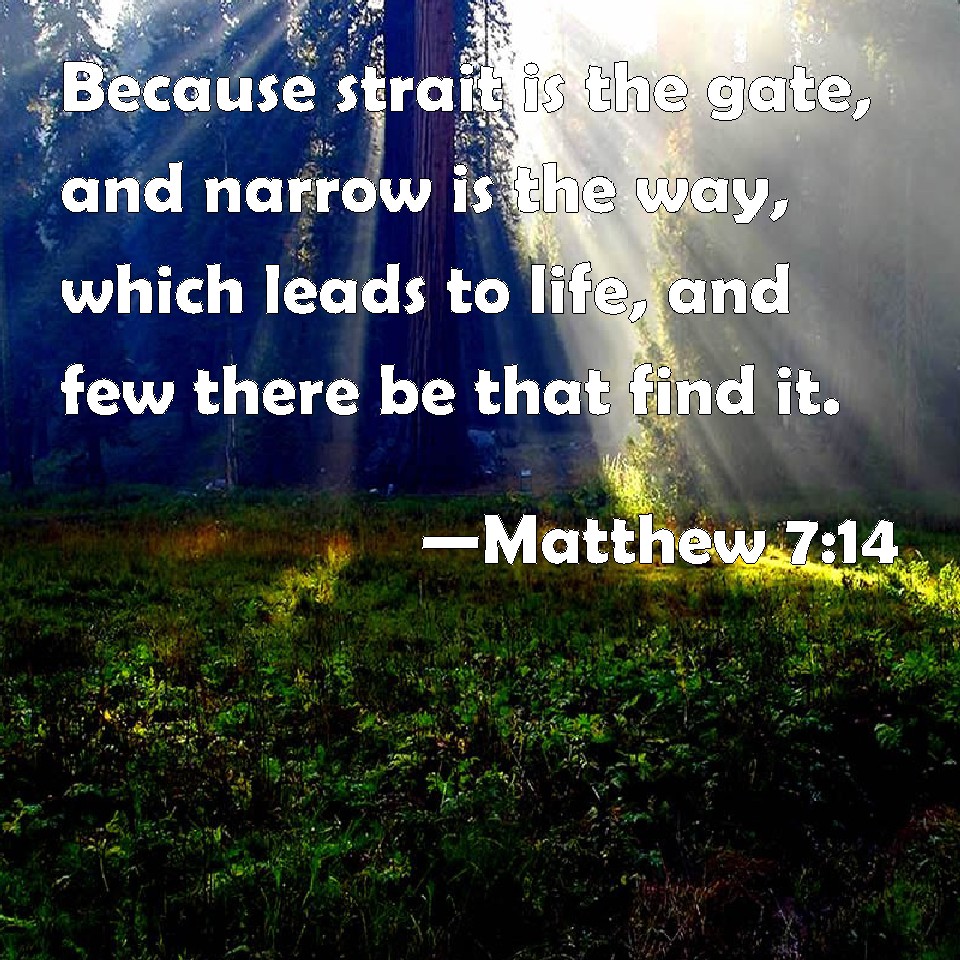 Choose a Background Matthew 7:14 Because strait is the gate, and narrow is the way, which leads to life, and few there be that find it. KJV: Because strait is the gate, and narrow is the way, which leadeth unto life, and few there be that find it. DRB: How narrow is the gate, and strait is the way that leadeth to life: and few there are that find it! DBT: For narrow the gate and straitened the way that leads to life, and they are few who find it. ERV: For narrow is the gate, and straitened the way, that leadeth unto life, and few be they that find it. WBT: Because strait is the gate, and narrow is the way, which leadeth to life, and few there are that find it. WEB: How narrow is the gate, and restricted is the way that leads to life! Few are those who find it. YLT: how strait is the gate, and compressed the way that is leading to the life, and few are those finding it!Links Matthew 7:14 NIV • Matthew 7:14 NLT • Matthew 7:14 ESV • Matthew 7:14 NASB • Matthew 7:14 KJV • Matthew 7:14 Interlinear • Matthew 7:14 Commentaries • Matthew 7:14 Parallel Texts • Matthew 7:14 Bible Apps • Matthew 7:14 Parallel • Bible Hub |