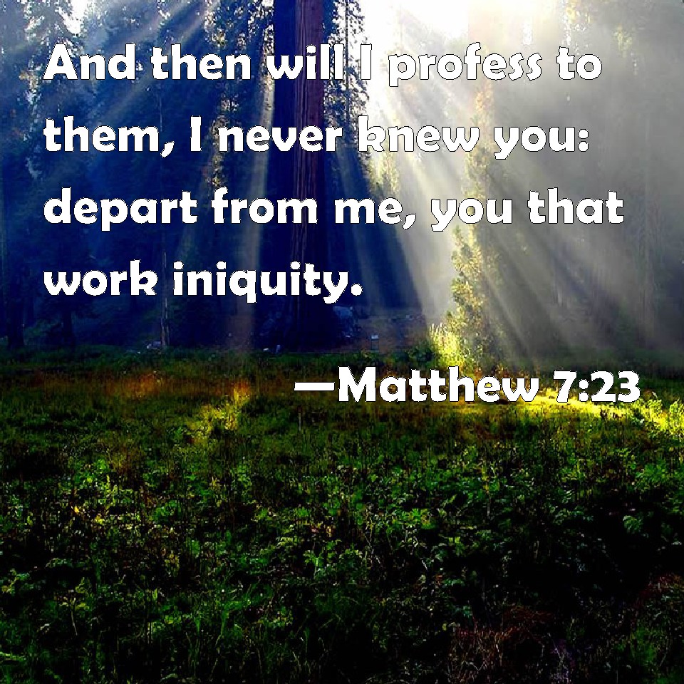 Choose a Background Matthew 7:23 And then will I profess to them, I never knew you: depart from me, you that work iniquity. KJV: And then will I profess unto them, I never knew you: depart from me, ye that work iniquity. DRB: And then will I profess unto them, I never knew you: depart from me, you that work iniquity. DBT: and then will I avow unto them, I never knew you. Depart from me, workers of lawlessness. ERV: And then will I profess unto them, I never knew you: depart from me, ye that work iniquity. WBT: And then will I profess to them, I never knew you: depart from me, ye that work iniquity. WEB: Then I will tell them, 'I never knew you. Depart from me, you who work iniquity.' YLT: and then I will acknowledge to them, that — I never knew you, depart from me ye who are working lawlessness.Links Matthew 7:23 NIV • Matthew 7:23 NLT • Matthew 7:23 ESV • Matthew 7:23 NASB • Matthew 7:23 KJV • Matthew 7:23 Interlinear • Matthew 7:23 Commentaries • Matthew 7:23 Parallel Texts • Matthew 7:23 Bible Apps • Matthew 7:23 Parallel • Bible Hub |