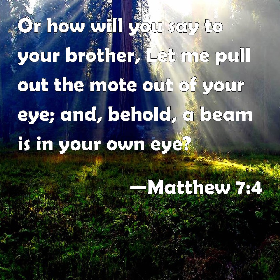 Choose a Background Matthew 7:4 Or how will you say to your brother, Let me pull out the mote out of your eye; and, behold, a beam is in your own eye? KJV: Or how wilt thou say to thy brother, Let me pull out the mote out of thine eye; and, behold, a beam is in thine own eye? DRB: Or how sayest thou to thy brother: Let me cast the mote out of thy eye; and behold a beam is in thy own eye? DBT: Or how wilt thou say to thy brother, Allow me, I will cast out the mote from thine eye; and behold, the beam is in thine eye? ERV: Or how wilt thou say to thy brother, Let me cast out the mote out of thine eye; and lo, the beam is in thine own eye? WBT: Or how wilt thou say to thy brother, Let me pull out the mote out of thy eye; and behold, a beam is in thy own eye? WEB: Or how will you tell your brother, 'Let me remove the speck from your eye;' and behold, the beam is in your own eye? YLT: or, how wilt thou say to thy brother, Suffer I may cast out the mote from thine eye, and lo, the beam is in thine own eye?Links Matthew 7:4 NIV • Matthew 7:4 NLT • Matthew 7:4 ESV • Matthew 7:4 NASB • Matthew 7:4 KJV • Matthew 7:4 Interlinear • Matthew 7:4 Commentaries • Matthew 7:4 Parallel Texts • Matthew 7:4 Bible Apps • Matthew 7:4 Parallel • Bible Hub |