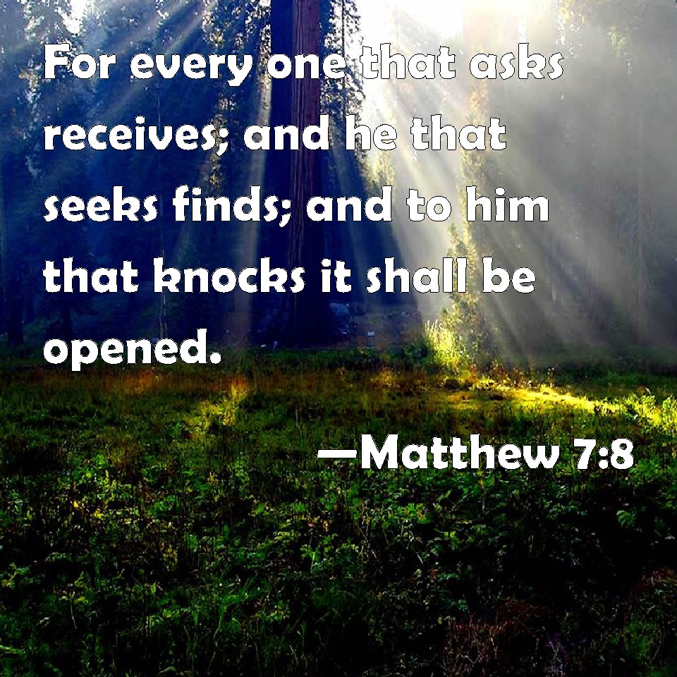 Matthew 7:8 For every one that asks receives; and he that seeks finds; and to him that knocks it shall be opened.