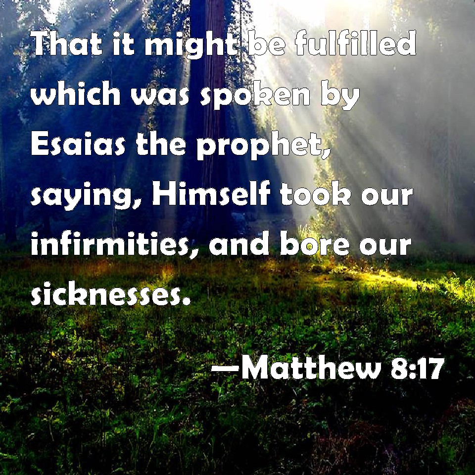 Choose a Background Matthew 8:17 That it might be fulfilled which was spoken by Esaias the prophet, saying, Himself took our infirmities, and bore our sicknesses. KJV: That it might be fulfilled which was spoken by Esaias the prophet, saying, Himself took our infirmities, and bare our sicknesses. DRB: That it might be fulfilled, which was spoken by the prophet Isaias, saying: He took our infirmities, and bore our diseases. DBT: so that that should be fulfilled which was spoken through Esaias the prophet, saying, Himself took our infirmities and bore our diseases. ERV: that it might be fulfilled which was spoken by Isaiah the prophet, saying, Himself took our infirmities, and bare our diseases. WBT: That it might be fulfilled which was spoken by Isaiah the prophet, saying, He himself took our infirmities, and bore our sicknesses. WEB: that it might be fulfilled which was spoken through Isaiah the prophet, saying: "He took our infirmities, and bore our diseases." YLT: that it might be fulfilled that was spoken through Isaiah the prophet, saying, 'Himself took our infirmities, and the sicknesses he did bear.'Links Matthew 8:17 NIV • Matthew 8:17 NLT • Matthew 8:17 ESV • Matthew 8:17 NASB • Matthew 8:17 KJV • Matthew 8:17 Interlinear • Matthew 8:17 Commentaries • Matthew 8:17 Parallel Texts • Matthew 8:17 Bible Apps • Matthew 8:17 Parallel • Bible Hub |