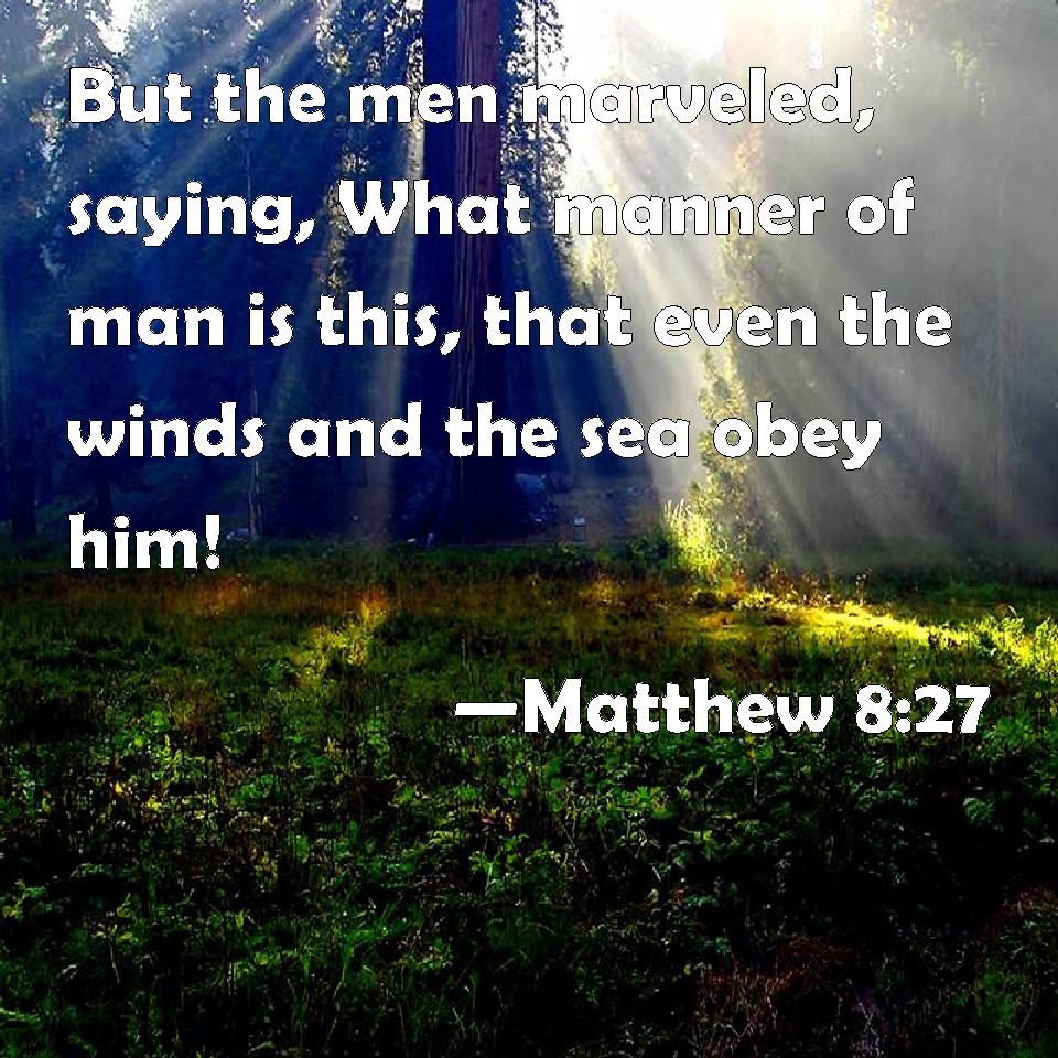 Choose a Background Matthew 8:27 But the men marveled, saying, What manner of man is this, that even the winds and the sea obey him! KJV: But the men marvelled, saying, What manner of man is this, that even the winds and the sea obey him! DRB: But the men wondered, saying: What manner of man is this, for the winds and the sea obey him? DBT: But the men were astonished, saying, What sort of man is this, that even the winds and the sea obey him? ERV: And the men marveled, saying, What manner of man is this, that even the winds and the sea obey him? WBT: But the men marveled, saying, What manner of man is this, that even the winds and the sea obey him! WEB: The men marveled, saying, "What kind of man is this, that even the wind and the sea obey him?" YLT: and the men wondered, saying, 'What kind — is this, that even the wind and the sea do obey him?'Links Matthew 8:27 NIV • Matthew 8:27 NLT • Matthew 8:27 ESV • Matthew 8:27 NASB • Matthew 8:27 KJV • Matthew 8:27 Interlinear • Matthew 8:27 Commentaries • Matthew 8:27 Parallel Texts • Matthew 8:27 Bible Apps • Matthew 8:27 Parallel • Bible Hub |