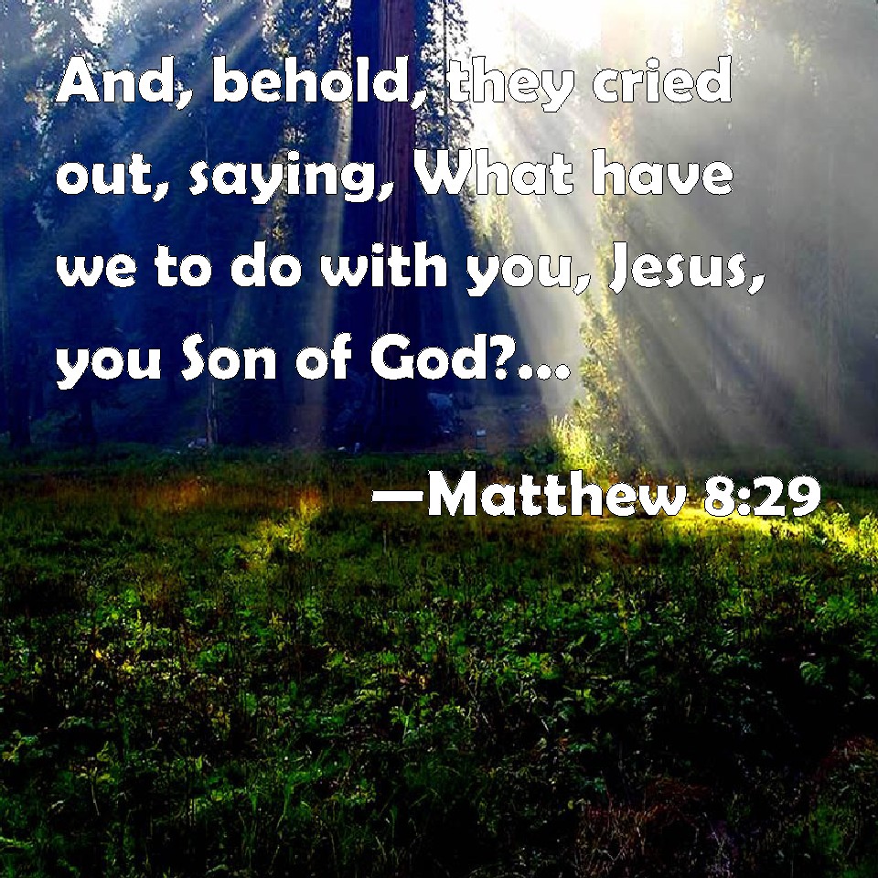 Choose a Background Matthew 8:29 And, behold, they cried out, saying, What have we to do with you, Jesus, you Son of God? are you come here to torment us before the time? KJV: And, behold, they cried out, saying, What have we to do with thee, Jesus, thou Son of God? art thou come hither to torment us before the time? DRB: And behold they cried out, saying: What have we to do with thee, Jesus Son of God? art thou come hither to torment us before the time? DBT: And behold, they cried out, saying, What have we to do with thee, Son of God? hast thou come here before the time to torment us? ERV: And behold, they cried out, saying, What have we to do with thee, thou Son of God? art thou come hither to torment us before the time? WBT: And behold, they cried out, saying, What have we to do with thee, Jesus, thou Son of God? art thou come hither to torment us before the time? WEB: Behold, they cried out, saying, "What do we have to do with you, Jesus, Son of God? Have you come here to torment us before the time?" YLT: and lo, they cried out, saying, 'What — to us and to thee, Jesus, Son of God? didst thou come hither, before the time, to afflict us?'Links Matthew 8:29 NIV • Matthew 8:29 NLT • Matthew 8:29 ESV • Matthew 8:29 NASB • Matthew 8:29 KJV • Matthew 8:29 Interlinear • Matthew 8:29 Commentaries • Matthew 8:29 Parallel Texts • Matthew 8:29 Bible Apps • Matthew 8:29 Parallel • Bible Hub |