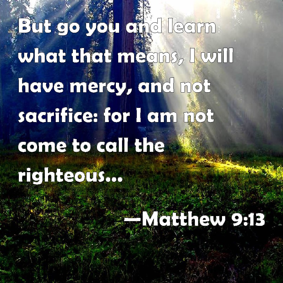 Choose a Background Matthew 9:13 But go you and learn what that means, I will have mercy, and not sacrifice: for I am not come to call the righteous, but sinners to repentance. KJV: But go ye and learn what that meaneth, I will have mercy, and not sacrifice: for I am not come to call the righteous, but sinners to repentance. DRB: Go then and learn what this meaneth, I will have mercy and not sacrifice. For I am not come to call the just, but sinners. DBT: But go and learn what that is I will have mercy and not sacrifice; for I have not come to call righteous men but sinners. ERV: But go ye and learn what this meaneth, I desire mercy, and not sacrifice: for I came not to call the righteous, but sinners. WBT: But go ye and learn what that meaneth, I will have mercy, and not sacrifice: for I am not come to call the righteous, but sinners to repentance. WEB: But you go and learn what this means: 'I desire mercy, and not sacrifice,' for I came not to call the righteous, but sinners to repentance." YLT: but having gone, learn ye what is, Kindness I will, and not sacrifice, for I did not come to call righteous men, but sinners, to reformation.'Links Matthew 9:13 NIV • Matthew 9:13 NLT • Matthew 9:13 ESV • Matthew 9:13 NASB • Matthew 9:13 KJV • Matthew 9:13 Interlinear • Matthew 9:13 Commentaries • Matthew 9:13 Parallel Texts • Matthew 9:13 Bible Apps • Matthew 9:13 Parallel • Bible Hub |