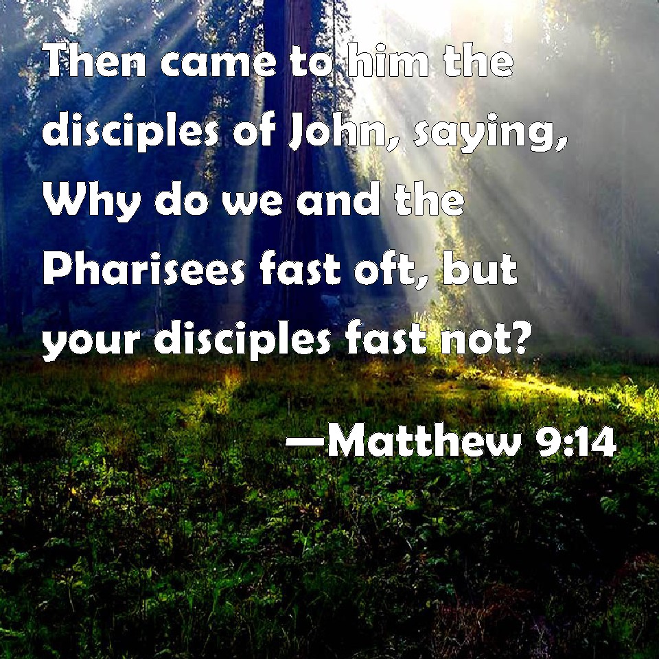 Choose a Background Matthew 9:14 Then came to him the disciples of John, saying, Why do we and the Pharisees fast oft, but your disciples fast not? KJV: Then came to him the disciples of John, saying, Why do we and the Pharisees fast oft, but thy disciples fast not? DRB: Then came to him the disciples of John, saying: Why do we and the Pharisees fast often, but thy disciples do not fast? DBT: Then come to him the disciples of John, saying, Why do we and the Pharisees often fast, but thy disciples fast not? ERV: Then come to him the disciples of John, saying, Why do we and the Pharisees fast oft, but thy disciples fast not? WBT: Then came to him the disciples of John, saying, Why do we and the Pharisees fast often, but thy disciples fast not? WEB: Then John's disciples came to him, saying, "Why do we and the Pharisees fast often, but your disciples don't fast?" YLT: Then come to him do the disciples of John, saying, 'Wherefore do we and the Pharisees fast much, and thy disciples fast not?'Links Matthew 9:14 NIV • Matthew 9:14 NLT • Matthew 9:14 ESV • Matthew 9:14 NASB • Matthew 9:14 KJV • Matthew 9:14 Interlinear • Matthew 9:14 Commentaries • Matthew 9:14 Parallel Texts • Matthew 9:14 Bible Apps • Matthew 9:14 Parallel • Bible Hub |