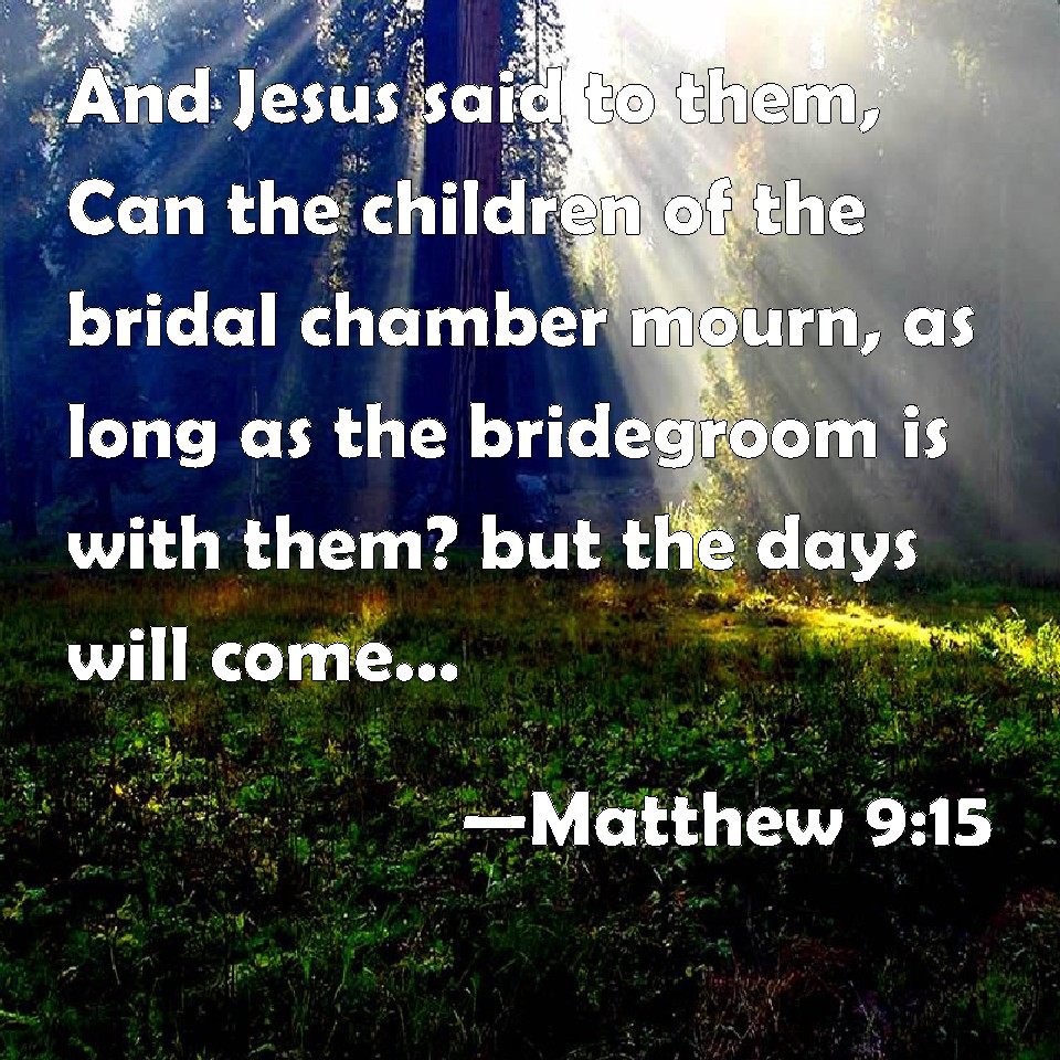 Choose a Background Matthew 9:15 And Jesus said to them, Can the children of the bridal chamber mourn, as long as the bridegroom is with them? but the days will come, when the bridegroom shall be taken from them, and then shall they fast. KJV: And Jesus said unto them, Can the children of the bridechamber mourn, as long as the bridegroom is with them? but the days will come, when the bridegroom shall be taken from them, and then shall they fast. DRB: And Jesus said to them: Can the children of the bridegroom mourn, as long as the bridegroom is with them? But the days will come, when the bridegroom shall be taken away from them, and then they shall fast. DBT: And Jesus said to them, Can the sons of the bridechamber mourn so long as the bridegroom is with them? But days will come when the bridegroom will have been taken away from them, and then they will fast. ERV: And Jesus said unto them, Can the sons of the bride-chamber mourn, as long as the bridegroom is with them? but the days will come, when the bridegroom shall be taken away from them, and then will they fast. WBT: And Jesus said to them, Can the children of the bride-chamber mourn, as long as the bridegroom is with them? but the days will come, when the bridegroom shall be taken from them, and then they will fast. WEB: Jesus said to them, "Can the friends of the bridegroom mourn, as long as the bridegroom is with them? But the days will come when the bridegroom will be taken away from them, and then they will fast. YLT: And Jesus said to them, 'Can the sons of the bride-chamber mourn, so long as the bridegroom is with them? but days shall come when the bridegroom may be taken from them, and then they shall fast.Links Matthew 9:15 NIV • Matthew 9:15 NLT • Matthew 9:15 ESV • Matthew 9:15 NASB • Matthew 9:15 KJV • Matthew 9:15 Interlinear • Matthew 9:15 Commentaries • Matthew 9:15 Parallel Texts • Matthew 9:15 Bible Apps • Matthew 9:15 Parallel • Bible Hub |