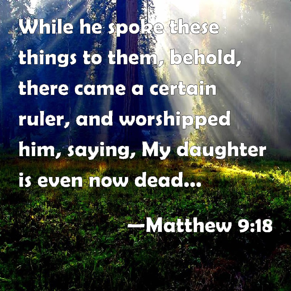 Choose a Background Matthew 9:18 While he spoke these things to them, behold, there came a certain ruler, and worshipped him, saying, My daughter is even now dead: but come and lay your hand on her, and she shall live. KJV: While he spake these things unto them, behold, there came a certain ruler, and worshipped him, saying, My daughter is even now dead: but come and lay thy hand upon her, and she shall live. DRB: As he was speaking these things unto them, behold a certain ruler came up, and adored him, saying: Lord, my daughter is even now dead; but come, lay thy hand upon her, and she shall live. DBT: As he spoke these things to them, behold, a ruler coming in did homage to him, saying, My daughter has by this died; but come and lay thy hand upon her and she shall live. ERV: While he spake these things unto them, behold, there came a ruler, and worshipped him, saying, My daughter is even now dead: but come and lay thy hand upon her, and she shall live. WBT: While he was speaking these things to them, behold, there came a certain ruler, and worshiped him, saying, My daughter is even now dead: but come and lay thy hand upon her, and she will live. WEB: While he told these things to them, behold, a ruler came and worshiped him, saying, "My daughter has just died, but come and lay your hand on her, and she will live." YLT: While he is speaking these things to them, lo, a ruler having come, was bowing to him, saying that 'My daughter just now died, but, having come, lay thy hand upon her, and she shall live.'Links Matthew 9:18 NIV • Matthew 9:18 NLT • Matthew 9:18 ESV • Matthew 9:18 NASB • Matthew 9:18 KJV • Matthew 9:18 Interlinear • Matthew 9:18 Commentaries • Matthew 9:18 Parallel Texts • Matthew 9:18 Bible Apps • Matthew 9:18 Parallel • Bible Hub |