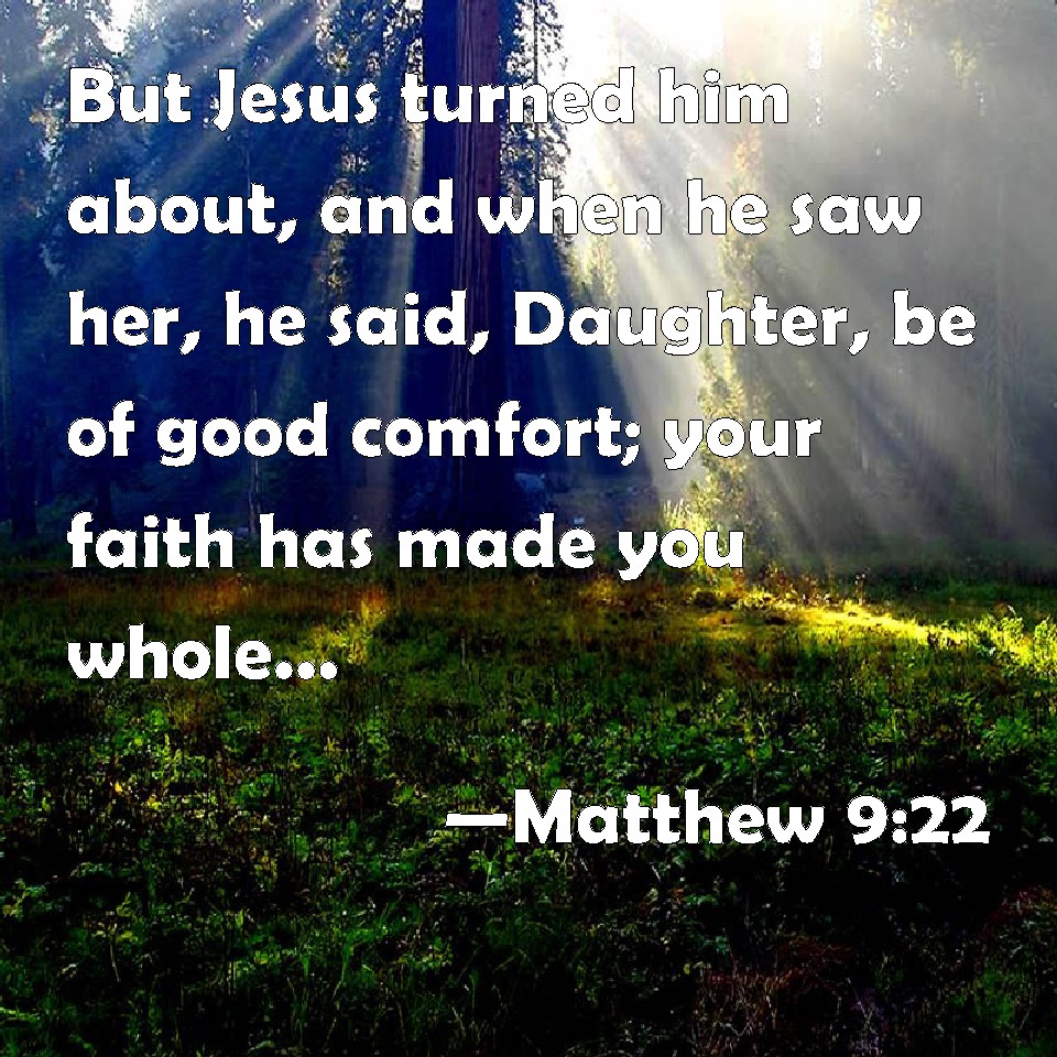 Choose a Background Matthew 9:22 But Jesus turned him about, and when he saw her, he said, Daughter, be of good comfort; your faith has made you whole. And the woman was made whole from that hour. KJV: But Jesus turned him about, and when he saw her, he said, Daughter, be of good comfort; thy faith hath made thee whole. And the woman was made whole from that hour. DRB: But Jesus turning and seeing her, said: Be of good heart, daughter, thy faith hath made thee whole. And the woman was made whole from that hour. DBT: But Jesus turning and seeing her, said, Be of good courage, daughter; thy faith has healed thee. And the woman was healed from that hour. ERV: But Jesus turning and seeing her said, Daughter, be of good cheer; thy faith hath made thee whole. And the woman was made whole from that hour. WBT: But Jesus turned himself about, and when he saw her, he said, Daughter, be of good comfort; thy faith hath made thee whole. And the woman was made whole from that hour.) WEB: But Jesus, turning around and seeing her, said, "Daughter, cheer up! Your faith has made you well." And the woman was made well from that hour. YLT: And Jesus having turned about, and having seen her, said, 'Be of good courage, daughter, thy faith hath saved thee,' and the woman was saved from that hour.Links Matthew 9:22 NIV • Matthew 9:22 NLT • Matthew 9:22 ESV • Matthew 9:22 NASB • Matthew 9:22 KJV • Matthew 9:22 Interlinear • Matthew 9:22 Commentaries • Matthew 9:22 Parallel Texts • Matthew 9:22 Bible Apps • Matthew 9:22 Parallel • Bible Hub |