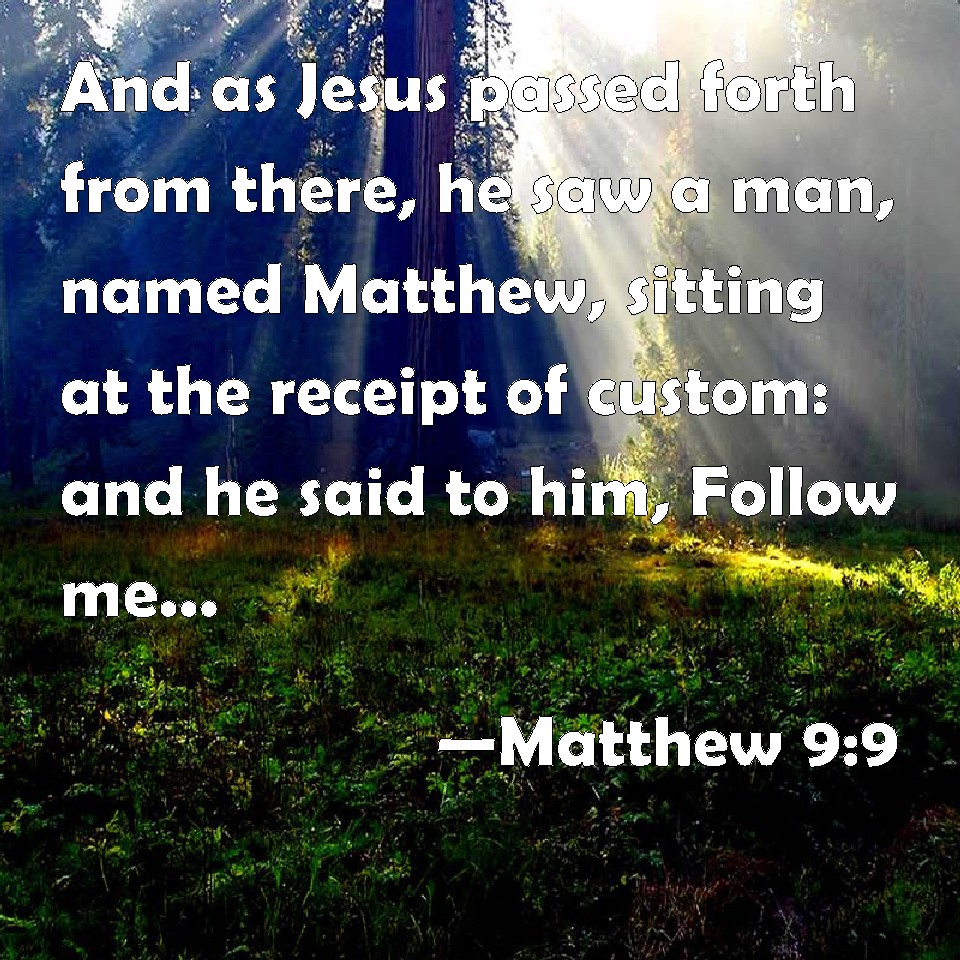 Matthew 9:9 And as Jesus passed forth from there, he saw a man, named Matthew, sitting at the receipt of custom: and he said to him, Follow me. And he arose, and followed him.
