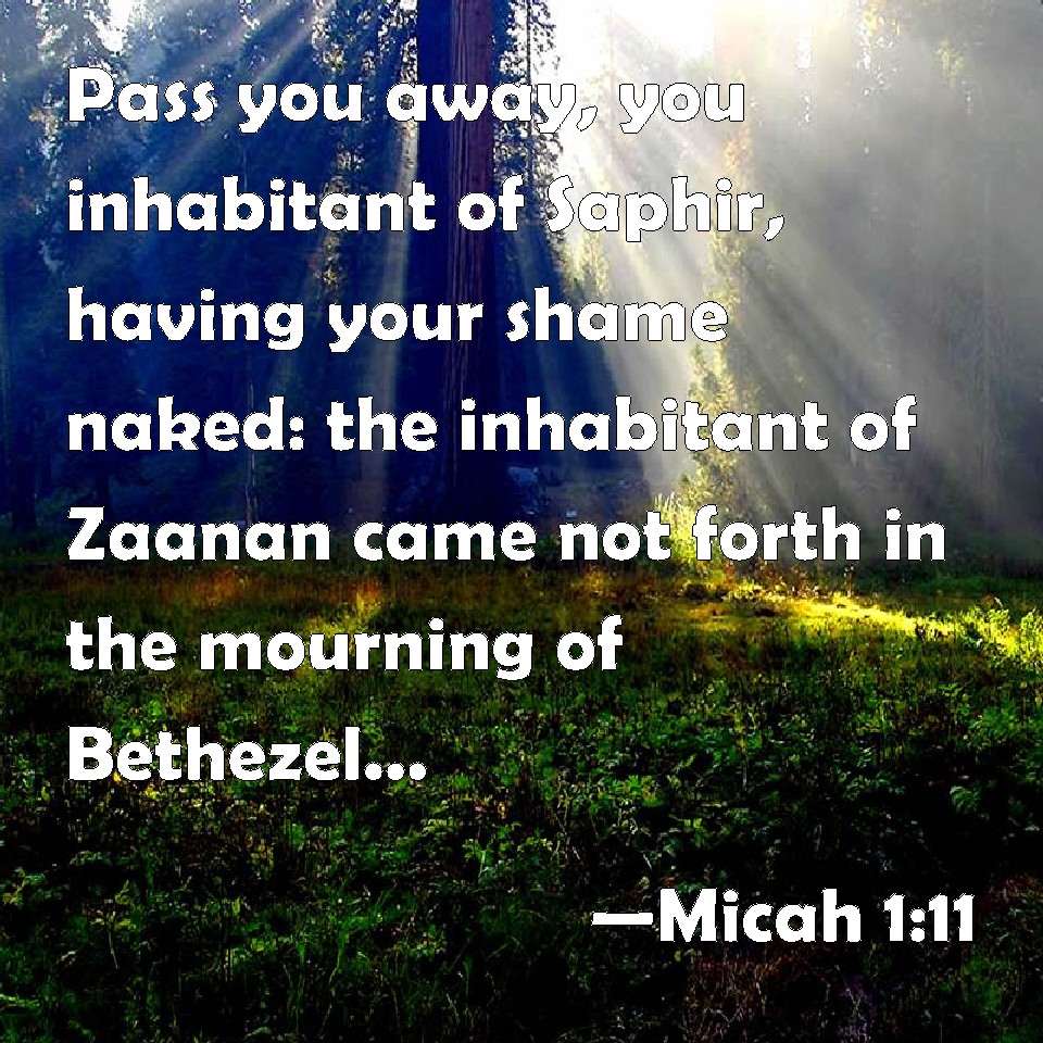Choose a Background Micah 1:11 Pass you away, you inhabitant of Saphir, having your shame naked: the inhabitant of Zaanan came not forth in the mourning of Bethezel; he shall receive of you his standing. KJV: Pass ye away, thou inhabitant of Saphir, having thy shame naked: the inhabitant of Zaanan came not forth in the mourning of Bethezel; he shall receive of you his standing. DRB: And pass away, O thou that dwellest in the Beautiful place, covered with thy shame: she went not forth that dwelleth in the confines: the House adjoining shall receive mourning from you, which stood by herself. DBT: Pass away, inhabitress of Shaphir, in nakedness and shame. The inhabitress of Zaanan is not come forth for the lamentation of Beth-ezel: he will take from you its shelter. ERV: Pass ye away, O inhabitant of Shaphir, in nakedness and shame: the inhabitant of Zaanan is not come forth; the wailing of Beth-ezel shall take from you the stay thereof. WBT: Pass ye away, thou inhabitant of Saphir, having thy shame exposed: the inhabitant of Zaanan came not forth in the mourning of Beth-ezel; he shall receive from you his standing. WEB: Pass on, inhabitant of Shaphir, in nakedness and shame. The inhabitant of Zaanan won't come out. The wailing of Beth Ezel will take from you his protection. YLT: Pass over for thee, O inhabitant of Shaphir, Naked one of shame. Not gone out hath the inhabitant of Zaanan, The lamentation of Beth-Ezel doth take from you its standing.Links Micah 1:11 NIV • Micah 1:11 NLT • Micah 1:11 ESV • Micah 1:11 NASB • Micah 1:11 KJV • Micah 1:11 Interlinear • Micah 1:11 Commentaries • Micah 1:11 Parallel Texts • Micah 1:11 Bible Apps • Micah 1:11 Parallel • Bible Hub |