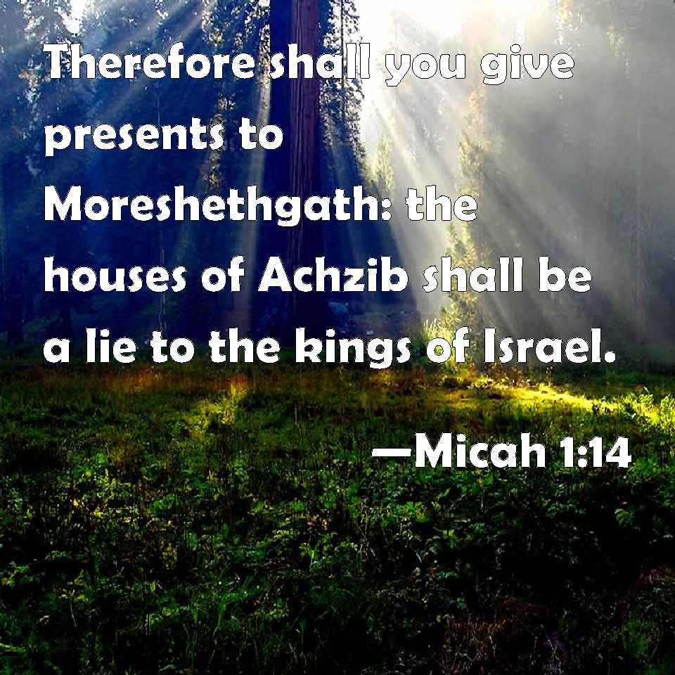 Micah 1:14 Therefore shall you give presents to Moreshethgath: the houses of Achzib shall be a lie to the kings of Israel.