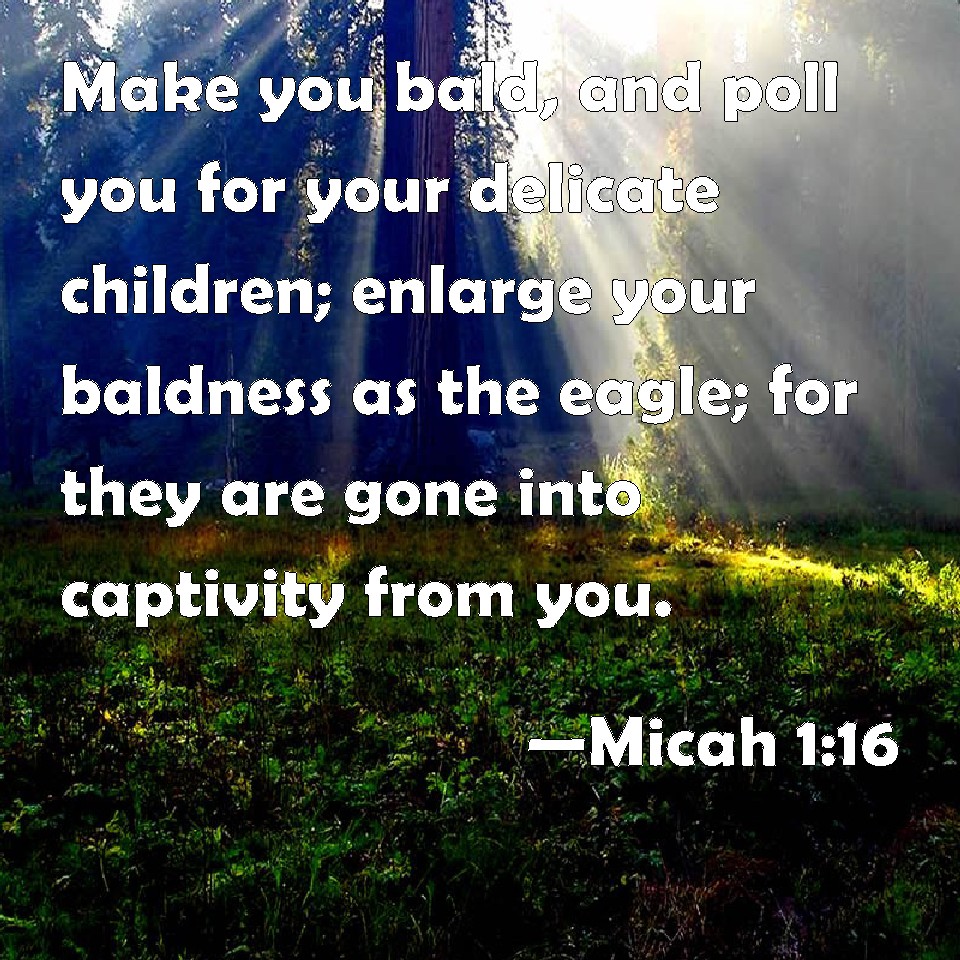 Choose a Background Micah 1:16 Make you bald, and poll you for your delicate children; enlarge your baldness as the eagle; for they are gone into captivity from you. KJV: Make thee bald, and poll thee for thy delicate children; enlarge thy baldness as the eagle; for they are gone into captivity from thee. DRB: Make thee bald, and be polled for thy delicate children: enlarge thy baldness as the eagle: for they are carried into captivity from thee. DBT: Make thee bald, and poll thee for the children of thy delights; enlarge thy baldness as the eagle, for they are gone into captivity from thee. ERV: Make thee bald, and poll thee for the children of thy delight: enlarge thy baldness as the eagle; for they are gone into captivity from thee. WBT: Make thee bald, and poll thee for thy delicate children; enlarge thy baldness as the eagle; for they are gone into captivity from thee. WEB: Shave your heads, and cut off your hair for the children of your delight. Enlarge your baldness like the vulture; for they have gone into captivity from you! YLT: Make bald and shave, for thy delightful sons, Enlarge thy baldness as an eagle, For they have removed from thee!Links Micah 1:16 NIV • Micah 1:16 NLT • Micah 1:16 ESV • Micah 1:16 NASB • Micah 1:16 KJV • Micah 1:16 Interlinear • Micah 1:16 Commentaries • Micah 1:16 Parallel Texts • Micah 1:16 Bible Apps • Micah 1:16 Parallel • Bible Hub |