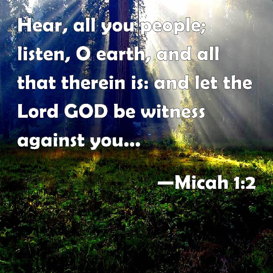 Micah 1:2 Hear, all you people; listen, O earth, and all that therein is: and let the Lord GOD be witness against you, the LORD from his holy temple.