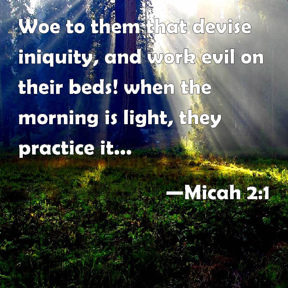 Choose a Background Micah 2:1 Woe to them that devise iniquity, and work evil on their beds! when the morning is light, they practice it, because it is in the power of their hand. KJV: Woe to them that devise iniquity, and work evil upon their beds! when the morning is light, they practise it, because it is in the power of their hand. DRB: Woe to you that devise that which is unprofitable, and work evil in your beds: in the morning light they execute it, because their hand is against God. DBT: Woe to them that devise iniquity and work evil upon their beds! When the morning is light they practise it, because it is in the power of their hand. ERV: Woe to them that devise iniquity and work evil upon their beds! when the morning is light, they practise it, because it is in the power of their hand. WBT: Woe to them that devise iniquity, and work evil upon their beds! when the morning is light, they practice it, because it is in the power of their hand. WEB: Woe to those who devise iniquity and work evil on their beds! When the morning is light, they practice it, because it is in the power of their hand. YLT: Woe to those devising iniquity, And working evil on their beds, In the light of the morning they do it, For their hand is — to God.Links Micah 2:1 NIV • Micah 2:1 NLT • Micah 2:1 ESV • Micah 2:1 NASB • Micah 2:1 KJV • Micah 2:1 Interlinear • Micah 2:1 Commentaries • Micah 2:1 Parallel Texts • Micah 2:1 Bible Apps • Micah 2:1 Parallel • Bible Hub |