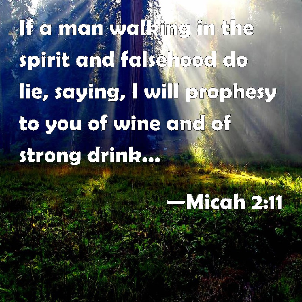 Choose a Background Micah 2:11 If a man walking in the spirit and falsehood do lie, saying, I will prophesy to you of wine and of strong drink; he shall even be the prophet of this people. KJV: If a man walking in the spirit and falsehood do lie, saying, I will prophesy unto thee of wine and of strong drink; he shall even be the prophet of this people. DRB: Would God I were not a man that hath the spirit, and that I rather spoke a lie: I will let drop to thee of wine, and of drunkenness: and it shall be this people upon whom it shall drop. DBT: If a man walking in wind and falsehood do lie, saying, I will prophesy unto thee of wine and of strong drink, he shall be the prophet of this people. ERV: If a man walking in wind and falsehood do lie, saying, I will prophesy unto thee of wine and of strong drink; he shall even be the prophet of this people. WBT: If a man walking in the spirit and falsehood doth lie, saying, I will prophesy to thee of wine and of strong drink; he shall even be the prophet of this people. WEB: If a man walking in a spirit of falsehood lies: "I will prophesy to you of wine and of strong drink;" he would be the prophet of this people. YLT: If one is going with the wind, And with falsehood hath lied: 'I prophesy to thee of wine, and of strong drink,' He hath been the prophet of this people!Links Micah 2:11 NIV • Micah 2:11 NLT • Micah 2:11 ESV • Micah 2:11 NASB • Micah 2:11 KJV • Micah 2:11 Interlinear • Micah 2:11 Commentaries • Micah 2:11 Parallel Texts • Micah 2:11 Bible Apps • Micah 2:11 Parallel • Bible Hub |