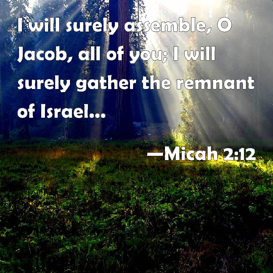 Choose a Background Micah 2:12 I will surely assemble, O Jacob, all of you; I will surely gather the remnant of Israel; I will put them together as the sheep of Bozrah, as the flock in the middle of their fold: they shall make great noise by reason of the multitude of men. KJV: I will surely assemble, O Jacob, all of thee; I will surely gather the remnant of Israel; I will put them together as the sheep of Bozrah, as the flock in the midst of their fold: they shall make great noise by reason of the multitude of men. DRB: I will assemble and gather together all of thee, O Jacob: I will bring together the remnant of Israel, I will put them together as a flock in the fold, as the sheep in the midst of the sheepcotes, they shall make a tumult by reason of the multitude of men. DBT: I will surely assemble, O Jacob, the whole of thee; I will surely gather the remnant of Israel; I will put them together as sheep of Bozrah, as a flock in the midst of their pasture: they shall make great noise by reason of the multitude of men. ERV: I will surely assemble, O Jacob, all of thee; I will surely gather the remnant of Israel; I will put them together as the sheep of Bozrah: as a flock in the midst of their pasture, they shall make great noise by reason of the multitude of men. WBT: I will surely assemble, O Jacob, all of thee; I will surely gather the remnant of Israel; I will put them together as the sheep of Bozrah, as the flock in the midst of their fold: they shall make great noise by reason of the multitude of men. WEB: I will surely assemble, Jacob, all of you; I will surely gather the remnant of Israel; I will put them together as the sheep of Bozrah, as a flock in the midst of their pasture; they will swarm with people. YLT: I do surely gather thee, O Jacob, all of thee, I surely bring together the remnant of Israel, Together I do set it as the flock of Bozrah, As a drove in the midst of its pasture, It maketh a noise because of man.Links Micah 2:12 NIV • Micah 2:12 NLT • Micah 2:12 ESV • Micah 2:12 NASB • Micah 2:12 KJV • Micah 2:12 Interlinear • Micah 2:12 Commentaries • Micah 2:12 Parallel Texts • Micah 2:12 Bible Apps • Micah 2:12 Parallel • Bible Hub |
