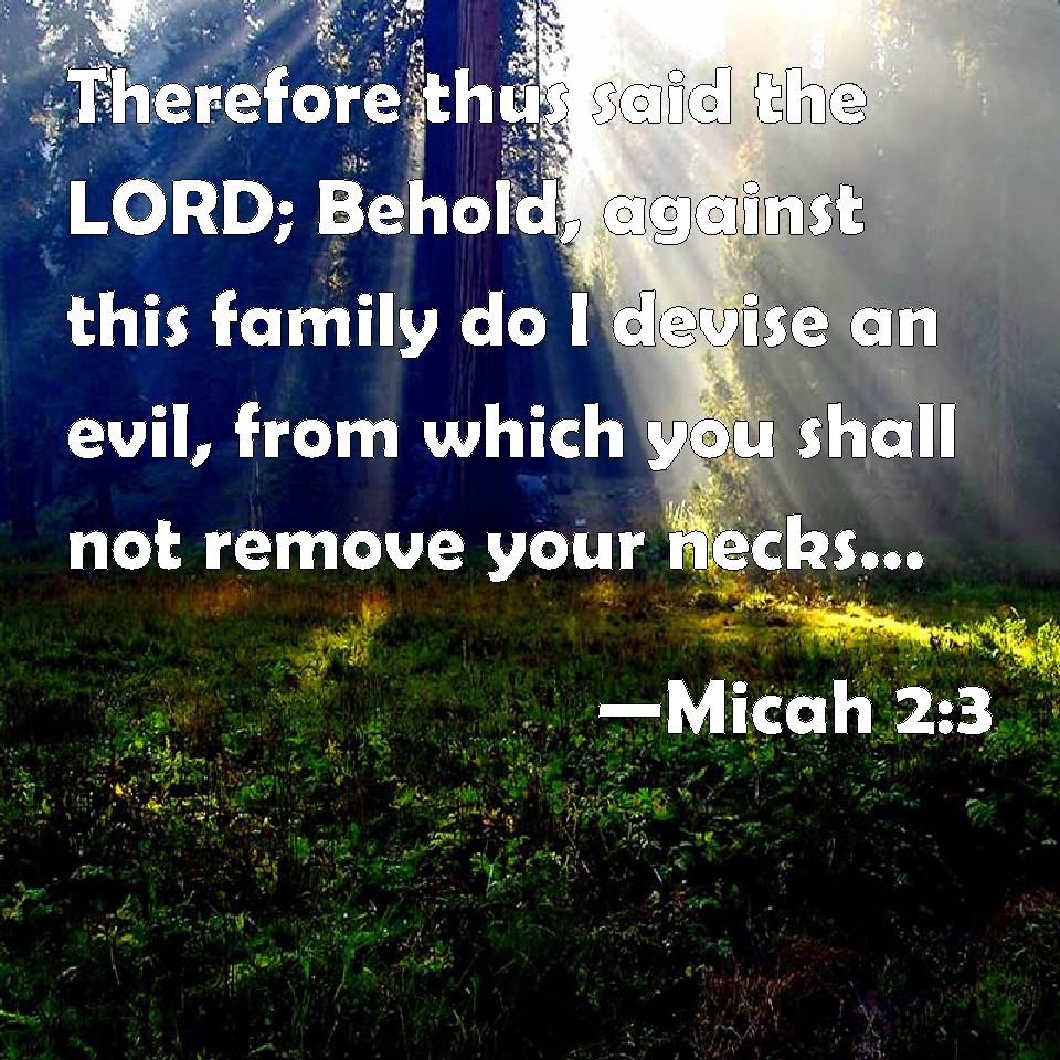 Choose a Background Micah 2:3 Therefore thus said the LORD; Behold, against this family do I devise an evil, from which you shall not remove your necks; neither shall you go haughtily: for this time is evil. KJV: Therefore thus saith the LORD; Behold, against this family do I devise an evil, from which ye shall not remove your necks; neither shall ye go haughtily: for this time is evil. DRB: Therefore thus saith the Lord : Behold, I devise an evil against this family: from which you shall not withdraw your necks, and you shall not walk haughtily, for this is a very evil time. DBT: Therefore thus saith Jehovah: Behold, against this family do I devise an evil, from which ye shall not remove your necks; neither shall ye walk haughtily: for it is an evil time. ERV: Therefore thus saith the LORD: Behold, against this family do I devise an evil, from which ye shall not remove your necks, neither shall ye walk haughtily; for it is an evil time. WBT: Therefore thus saith the LORD; Behold, against this family do I devise an evil, from which ye shall not remove your necks; neither shall ye go haughtily: for this time is evil. WEB: Therefore thus says Yahweh: "Behold, I am planning against these people a disaster, from which you will not remove your necks, neither will you walk haughtily; for it is an evil time. YLT: Therefore, thus said Jehovah: Lo, I am devising against this family evil, From which ye do not remove your necks, Nor walk loftily, for a time of evil it is.Links Micah 2:3 NIV • Micah 2:3 NLT • Micah 2:3 ESV • Micah 2:3 NASB • Micah 2:3 KJV • Micah 2:3 Interlinear • Micah 2:3 Commentaries • Micah 2:3 Parallel Texts • Micah 2:3 Bible Apps • Micah 2:3 Parallel • Bible Hub |