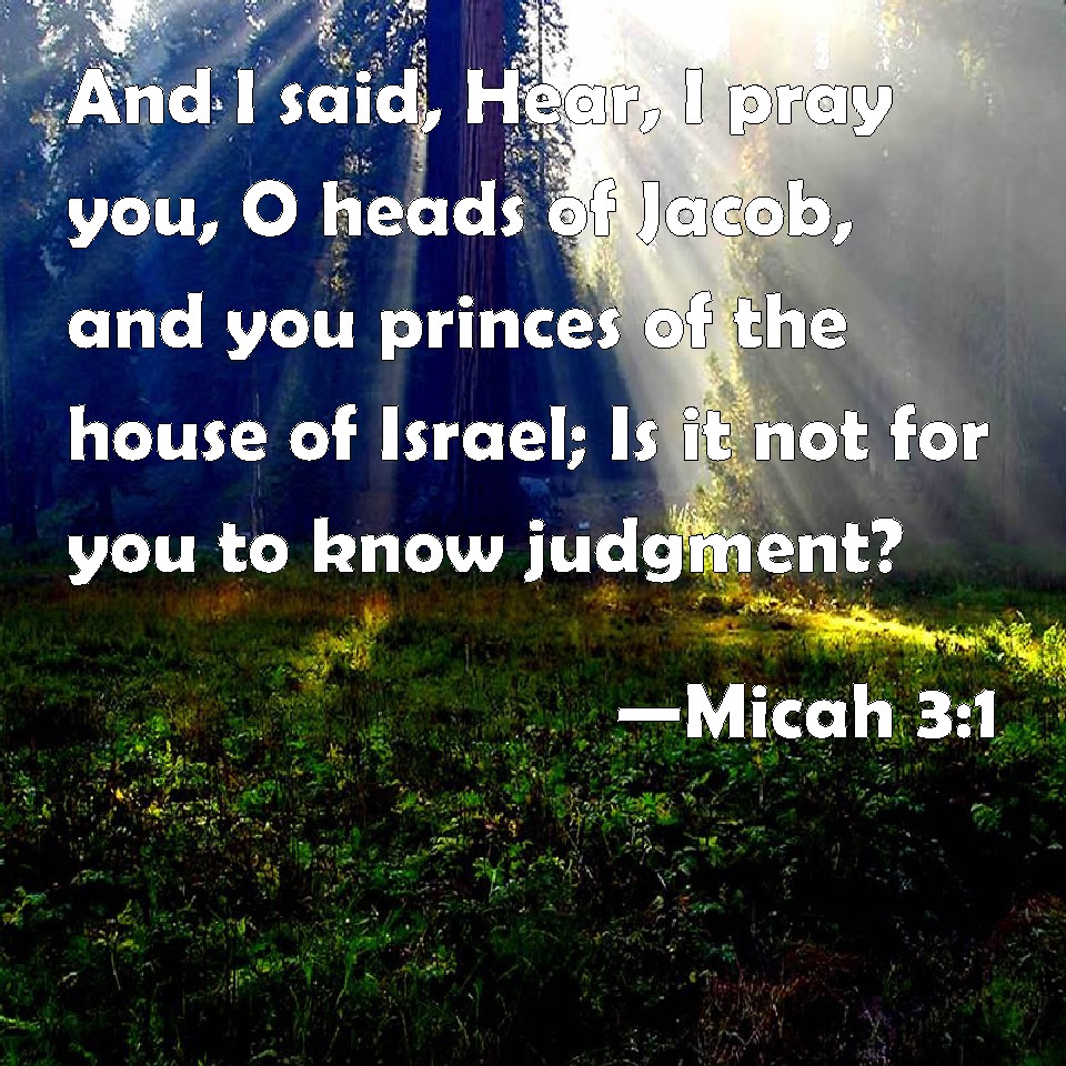 Choose a Background Micah 3:1 And I said, Hear, I pray you, O heads of Jacob, and you princes of the house of Israel; Is it not for you to know judgment? KJV: And I said, Hear, I pray you, O heads of Jacob, and ye princes of the house of Israel; Is it not for you to know judgment? DRB: And I said: Hear, O ye princes of Jacob, and ye chiefs of the house of Israel: Is it not your part to know judgment, DBT: And I said, Hear, I pray you, ye heads of Jacob, and princes of the house of Israel: Is it not for you to know judgment? ERV: And I said, Hear, I pray you, ye heads of Jacob, and rulers of the house of Israel: is it not for you to know judgment? WBT: And I said, Hear, I pray you, O heads of Jacob, and ye princes of the house of Israel: Is it not for you to know judgment? WEB: I said, "Please listen, you heads of Jacob, and rulers of the house of Israel: Isn't it for you to know justice? YLT: And I say, 'Hear, I pray you, heads of Jacob, And ye judges of the house of Israel, Is it not for you to know the judgment?Links Micah 3:1 NIV • Micah 3:1 NLT • Micah 3:1 ESV • Micah 3:1 NASB • Micah 3:1 KJV • Micah 3:1 Interlinear • Micah 3:1 Commentaries • Micah 3:1 Parallel Texts • Micah 3:1 Bible Apps • Micah 3:1 Parallel • Bible Hub |
