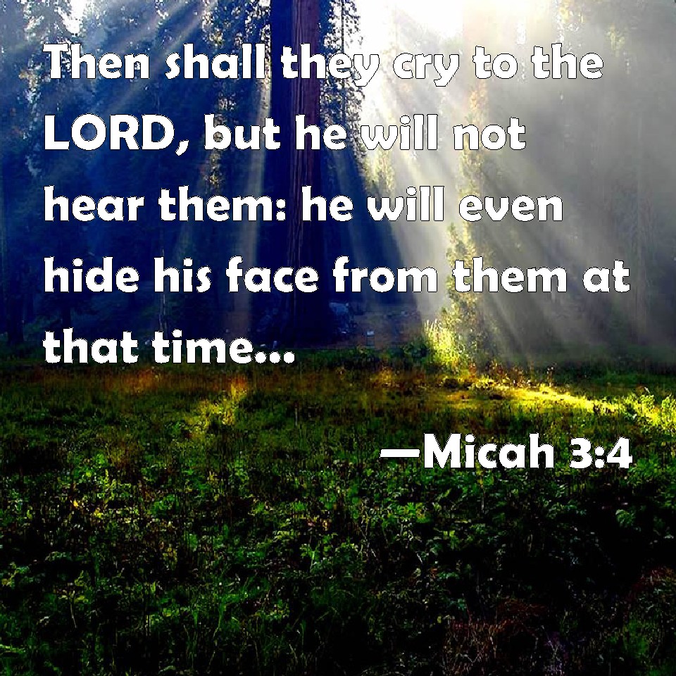 Choose a Background Micah 3:4 Then shall they cry to the LORD, but he will not hear them: he will even hide his face from them at that time, as they have behaved themselves ill in their doings. KJV: Then shall they cry unto the LORD, but he will not hear them: he will even hide his face from them at that time, as they have behaved themselves ill in their doings. DRB: Then shall they cry to the Lord, and he will not hear them: and he will hide his face from them at that time, as they have behaved wickedly in their devices. DBT: Then shall they cry unto Jehovah, but he will not answer them; and he will hide his face from them at that time, according as they have wrought evil in their doings. ERV: Then shall they cry unto the LORD, but he will not answer them: yea, he will hide his face from them at that time, according as they have wrought evil in their doings. WBT: Then shall they cry to the LORD, but he will not hear them: he will even hide his face from them at that time, as they have behaved themselves ill in their doings. WEB: Then they will cry to Yahweh, but he will not answer them. Yes, he will hide his face from them at that time, because they made their deeds evil." YLT: Then do they cry unto Jehovah, And He doth not answer them, And hideth His face from them at that time, As they have made evil their doings.Links Micah 3:4 NIV • Micah 3:4 NLT • Micah 3:4 ESV • Micah 3:4 NASB • Micah 3:4 KJV • Micah 3:4 Interlinear • Micah 3:4 Commentaries • Micah 3:4 Parallel Texts • Micah 3:4 Bible Apps • Micah 3:4 Parallel • Bible Hub |