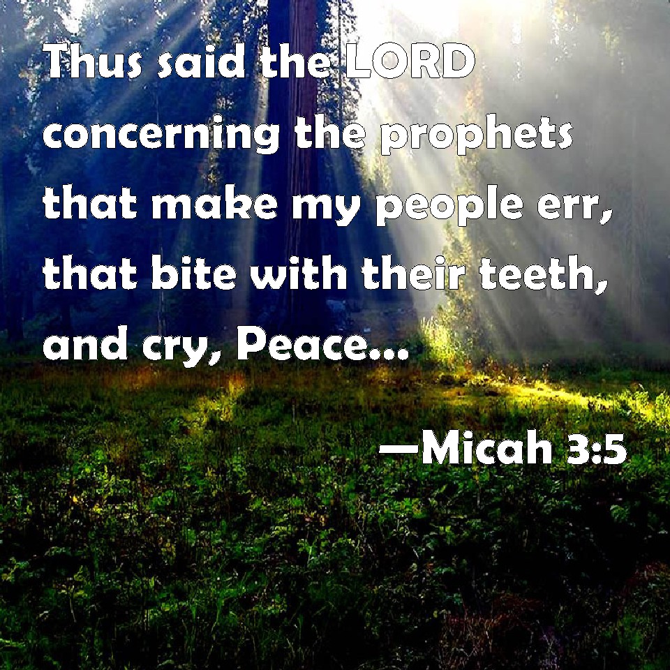 Choose a Background Micah 3:5 Thus said the LORD concerning the prophets that make my people err, that bite with their teeth, and cry, Peace; and he that puts not into their mouths, they even prepare war against him. KJV: Thus saith the LORD concerning the prophets that make my people err, that bite with their teeth, and cry, Peace; and he that putteth not into their mouths, they even prepare war against him. DRB: Thus saith the Lord concerning the prophets that make my people err: that bite with their teeth, and preach peace: and if a man give not something into their mouth, they prepare war against him. DBT: Thus saith Jehovah concerning the prophets that cause my people to err, that bite with their teeth, and cry, Peace! but whoso putteth not into their mouths they prepare war against him: ERV: Thus saith the LORD concerning the prophets that make my people to err; that bite with their teeth and cry, Peace; and whoso putteth not into their mouths, they even prepare war against him: WBT: Thus saith the LORD concerning the prophets that make my people err, that bite with their teeth, and cry, Peace; and he that putteth not into their mouths, they even prepare war against him: WEB: Thus says Yahweh concerning the prophets who lead my people astray; for those who feed their teeth, they proclaim, "Peace!" and whoever doesn't provide for their mouths, they prepare war against him: YLT: Thus said Jehovah concerning the prophets Who are causing My people to err, Who are biting with their teeth, And have cried 'Peace,' And he who doth not give unto their mouth, They have sanctified against him war.Links Micah 3:5 NIV • Micah 3:5 NLT • Micah 3:5 ESV • Micah 3:5 NASB • Micah 3:5 KJV • Micah 3:5 Interlinear • Micah 3:5 Commentaries • Micah 3:5 Parallel Texts • Micah 3:5 Bible Apps • Micah 3:5 Parallel • Bible Hub |