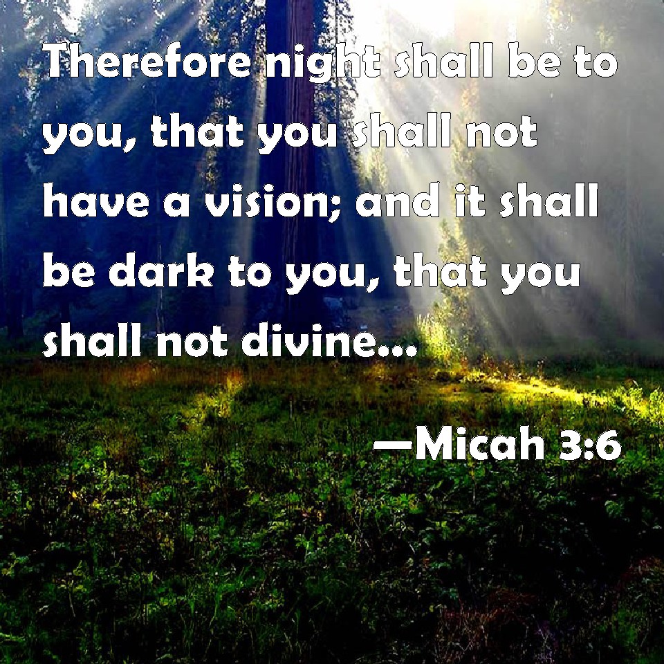 Choose a Background Micah 3:6 Therefore night shall be to you, that you shall not have a vision; and it shall be dark to you, that you shall not divine; and the sun shall go down over the prophets, and the day shall be dark over them. KJV: Therefore night shall be unto you, that ye shall not have a vision; and it shall be dark unto you, that ye shall not divine; and the sun shall go down over the prophets, and the day shall be dark over them. DRB: Therefore night shall be to you instead of vision, and darkness to you instead of divination; and the sun shall go down upon the prophets, and the day shall be darkened over them. DBT: therefore ye shall have night without a vision; and it shall be dark unto you, without divination; and the sun shall go down upon the prophets, and the day shall be black over them. ERV: Therefore it shall be night unto you, that ye shall have no vision; and it shall be dark unto you, that ye shall not divine; and the sun shall go down upon the prophets, and the day shall be black over them. WBT: Therefore night shall be to you, that ye shall not have a vision; and it shall be dark to you, that ye shall not divine; and the sun shall go down over the prophets, and the day shall be dark over them. WEB: "Therefore night is over you, with no vision, and it is dark to you, that you may not divine; and the sun will go down on the prophets, and the day will be black over them. YLT: Therefore a night ye have without vision, And darkness ye have without divination, And gone in hath the sun on the prophets, And black over them hath been the day.Links Micah 3:6 NIV • Micah 3:6 NLT • Micah 3:6 ESV • Micah 3:6 NASB • Micah 3:6 KJV • Micah 3:6 Interlinear • Micah 3:6 Commentaries • Micah 3:6 Parallel Texts • Micah 3:6 Bible Apps • Micah 3:6 Parallel • Bible Hub |