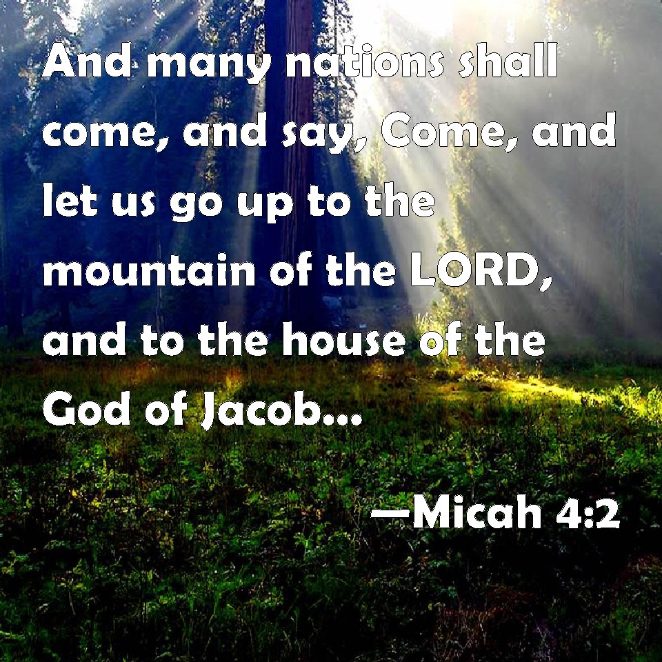 Choose a Background Micah 4:2 And many nations shall come, and say, Come, and let us go up to the mountain of the LORD, and to the house of the God of Jacob; and he will teach us of his ways, and we will walk in his paths: for the law shall go forth of Zion, and the word of the LORD from Jerusalem. KJV: And many nations shall come, and say, Come, and let us go up to the mountain of the LORD, and to the house of the God of Jacob; and he will teach us of his ways, and we will walk in his paths: for the law shall go forth of Zion, and the word of the LORD from Jerusalem. DRB: And many nations shall come in haste, and say: Come, let us go up to the mountain of the Lord, and to the house of the God of Jacob: and he will teach us of his ways, and we will walk in his paths: for the law shall go forth out of Sion, and the word of the Lord out of Jerusalem. DBT: And many nations shall go and say, Come, and let us go up to the mountain of Jehovah, and to the house of the God of Jacob; and he will teach us of his ways, and we will walk in his paths. For out of Zion shall go forth the law, and Jehovah's word from Jerusalem. ERV: And many nations shall go and say, Come ye, and let us go up to the mountain of the LORD, and to the house of the God of Jacob; and he will teach us of his ways, and we will walk in his paths: for out of Zion shall go forth the law, and the word of the LORD from Jerusalem. WBT: And many nations shall come, and say, Come, and let us go up to the mountain of the LORD, and to the house of the God of Jacob; and he will teach us of his ways, and we will walk in his paths: for the law shall go forth from Zion, and the word of the LORD from Jerusalem. WEB: Many nations will go and say, "Come, and let us go up to the mountain of Yahweh, and to the house of the God of Jacob; and he will teach us of his ways, and we will walk in his paths." For out of Zion will go forth the law, and the word of Yahweh from Jerusalem; YLT: And gone have many nations and said, Come and we go up to the mount of Jehovah, And unto the house of the God of Jacob, And He doth teach us of His ways, And we do walk in His paths, For from Zion doth go forth a law, And a word of Jehovah from Jerusalem.Links Micah 4:2 NIV • Micah 4:2 NLT • Micah 4:2 ESV • Micah 4:2 NASB • Micah 4:2 KJV • Micah 4:2 Interlinear • Micah 4:2 Commentaries • Micah 4:2 Parallel Texts • Micah 4:2 Bible Apps • Micah 4:2 Parallel • Bible Hub |