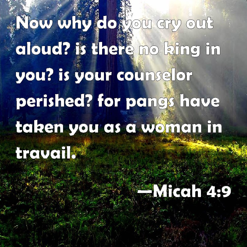 Micah 4:9 Now why do you cry out aloud? is there no king in you? is your counselor perished? for pangs have taken you as a woman in travail.